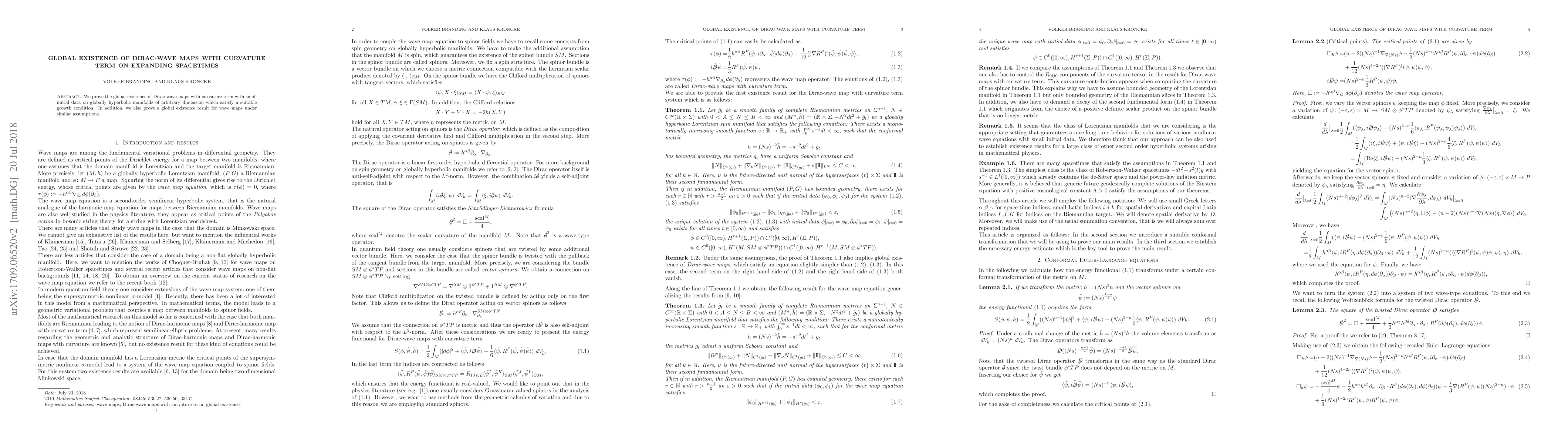 This paper proves the global existence of Dirac-wave maps with a curvature term for small initial data on globally hyperbolic manifolds, along with a similar result for wave maps under the same conditions. The focus is on manifolds with suitable growth conditions.