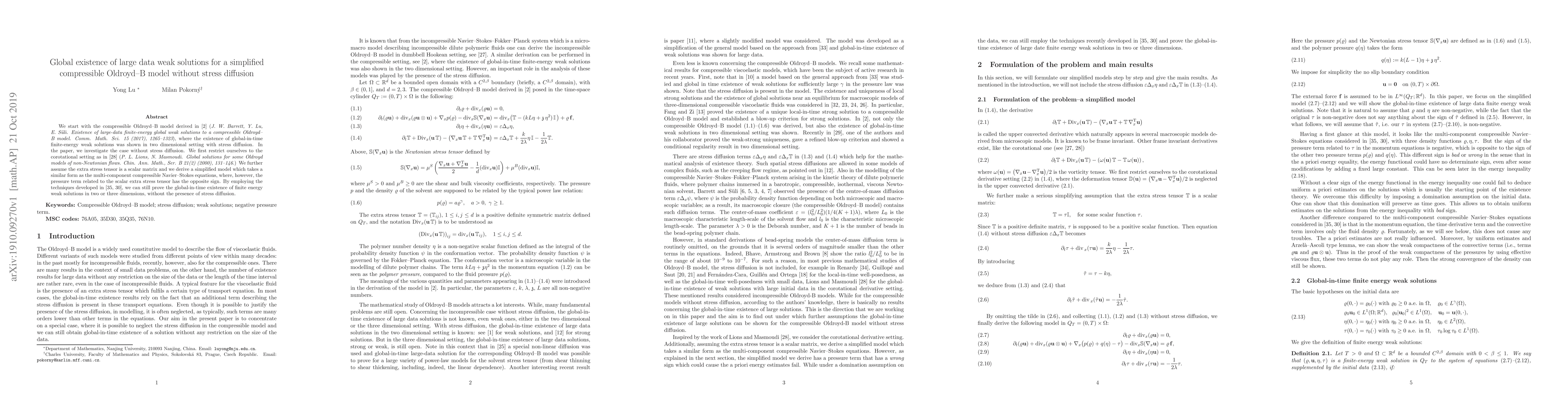 This paper investigates the global existence of large data weak solutions for a simplified compressible Oldroyd-B model without stress diffusion. By employing advanced techniques, the authors prove the global-in-time existence of finite energy weak solutions in two or three dimensions, even without the presence of stress diffusion.