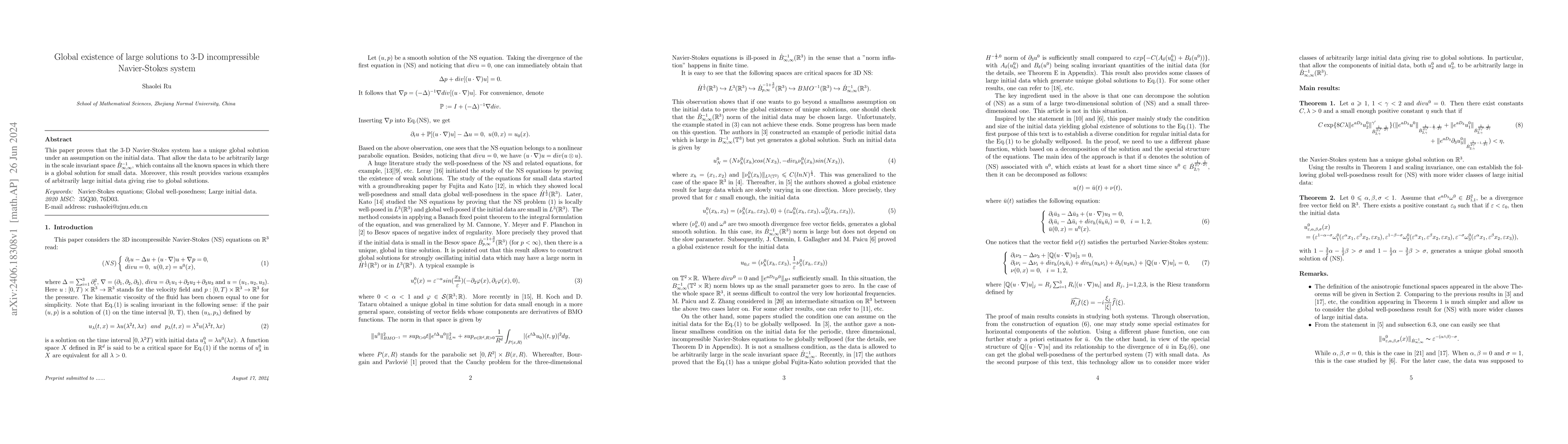 This paper proves that the 3-D Navier-Stokes system has a unique global solution under an assumpution on the initial data. That allow the data to be arbitrarily large in the scale invariant space \dot{B}_{\infty,\infty}^{-1}, which contains all the known spaces in which there is a global solution for small data. Moreover, this result provides various examples of arbitrarily large initial data giving rise to global solutions.