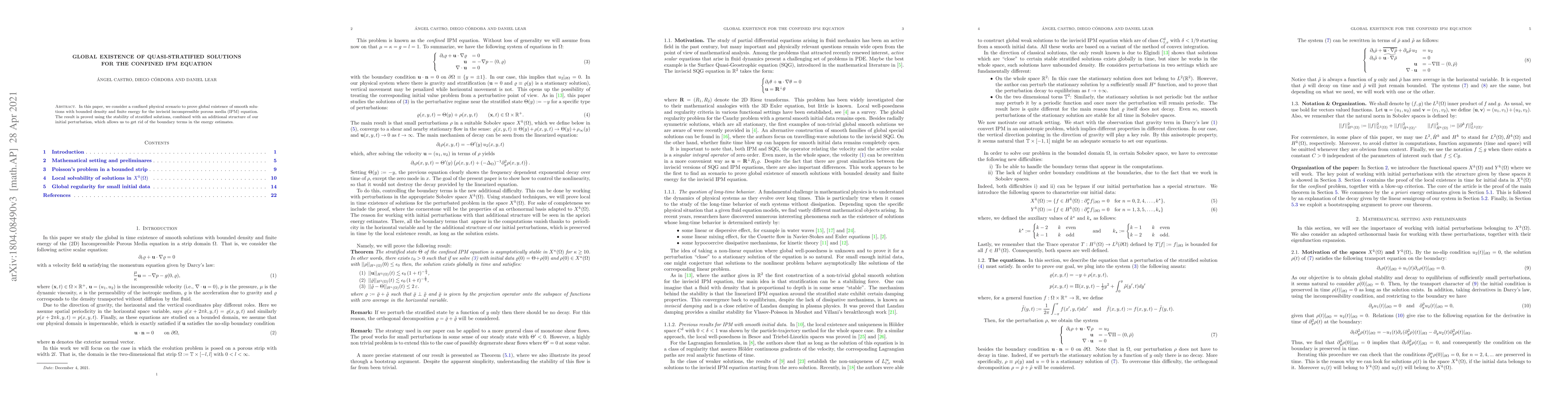 This paper proves global existence of smooth, bounded density, and finite energy solutions for the inviscid incompressible porous media equation in a confined physical scenario, leveraging the stability of stratified solutions and the structure of initial perturbations to eliminate boundary terms in energy estimates.