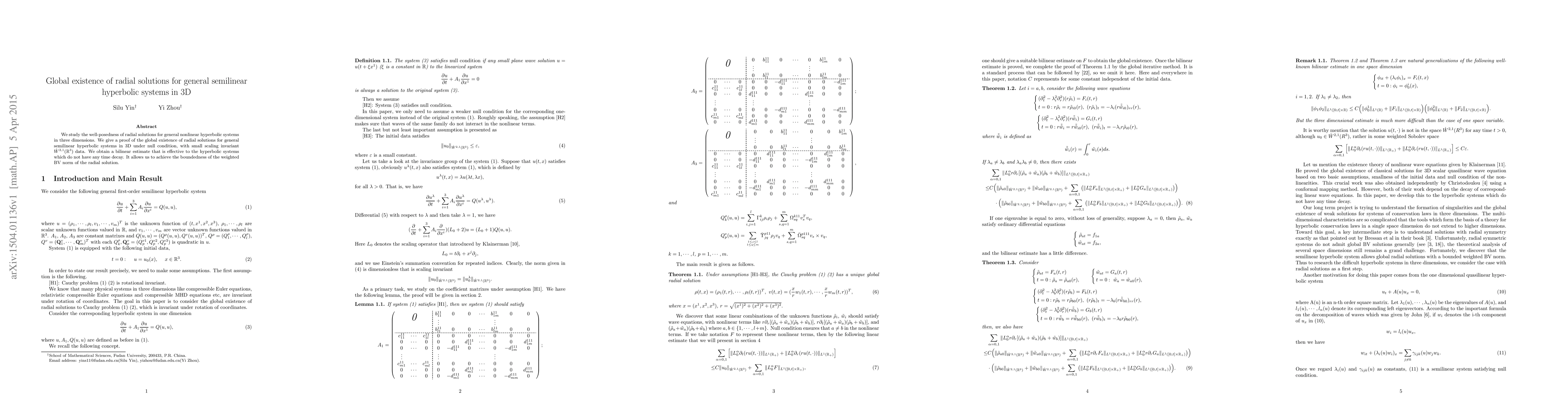 This paper proves the global existence of radial solutions for general semilinear hyperbolic systems in 3D under null conditions, using small scaling invariant data. It introduces a bilinear estimate to manage systems without time decay, ensuring the boundedness of the weighted BV norm of the radial solution.