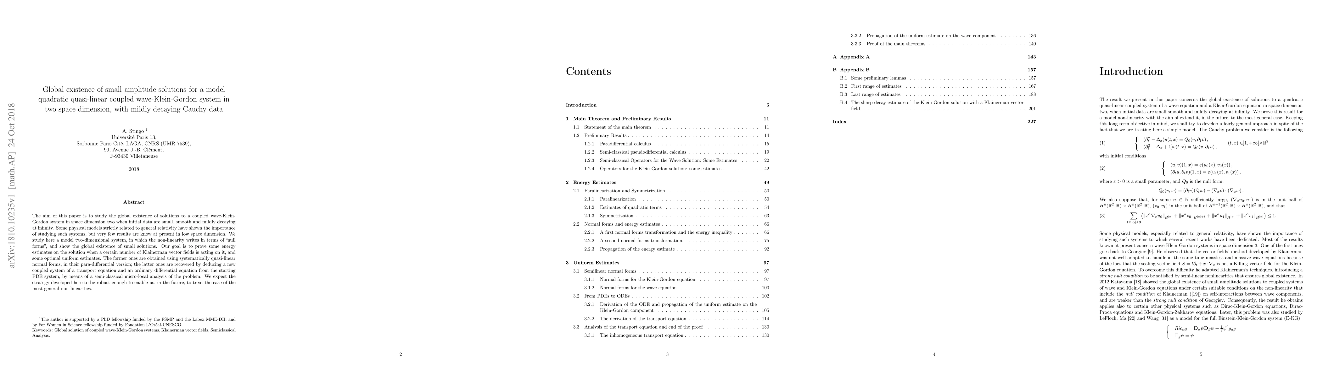 This paper investigates the global existence of small amplitude solutions for a coupled wave-Klein-Gordon system in two dimensions, with initial data that are small, smooth, and mildly decaying. The authors employ quasi-linear normal forms and semi-classical micro-local analysis to derive energy estimates and optimal uniform bounds, aiming to extend the developed strategy to more general non-linearities.