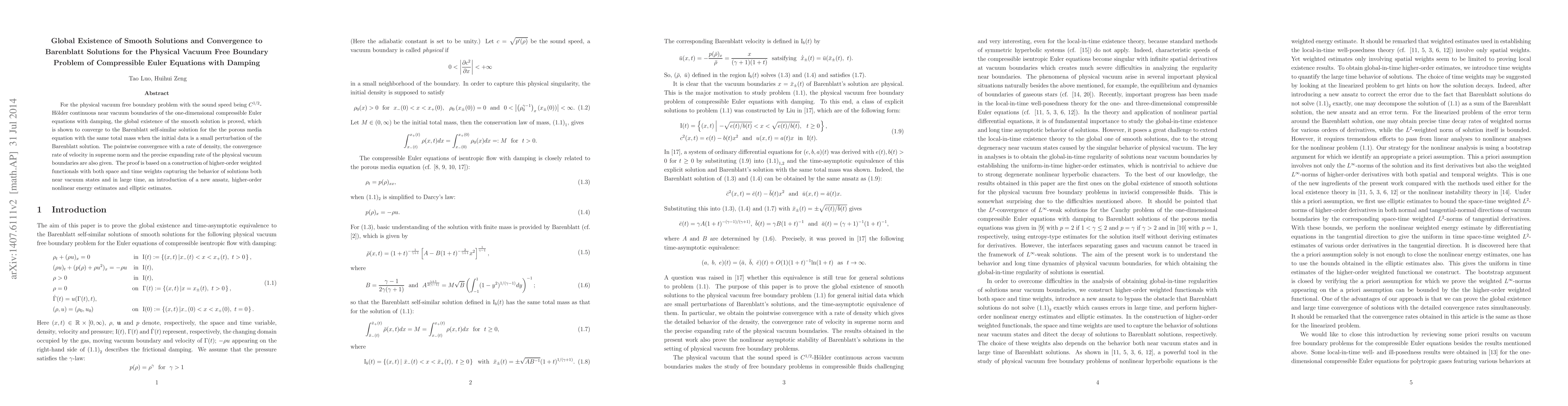 This paper proves the global existence of smooth solutions for the compressible Euler equations with damping and demonstrates their convergence to Barenblatt solutions under small perturbations. The analysis includes pointwise density convergence, velocity convergence, and precise rates for the expansion of vacuum boundaries.
