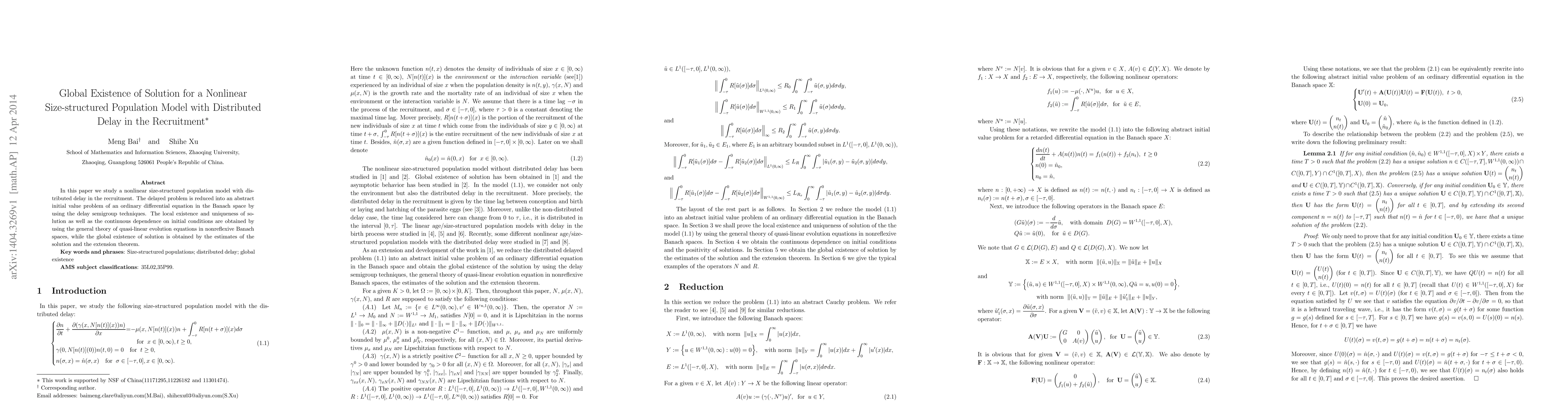 This paper investigates a nonlinear size-structured population model with distributed delay in recruitment, establishing local existence and uniqueness of solutions via quasi-linear evolution equations. Global existence is proven through solution estimates and the extension theorem.
