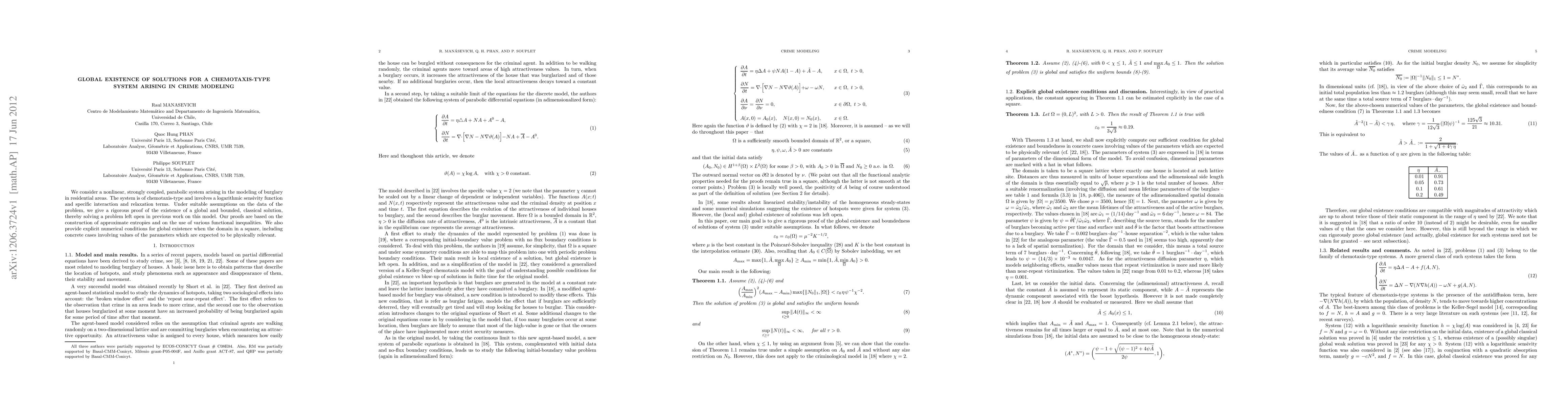 We consider a nonlinear, strongly coupled, parabolic system arising in the modeling of burglary in residential areas. The system is of chemotaxis-type and involves a logarithmic sensivity function and specific interaction and relaxation terms. Under suitable assumptions on the data of the problem, we give a rigorous proof of the existence of a global and bounded, classical solution, thereby solving a problem left open in previous work on this model. Our proofs are based on the construction of approximate entropies and on the use of various functional inequalities. We also provide explicit numerical conditions for global existence when the domain in a square, including concrete cases involving values of the parameters which are expected to be physically relevant