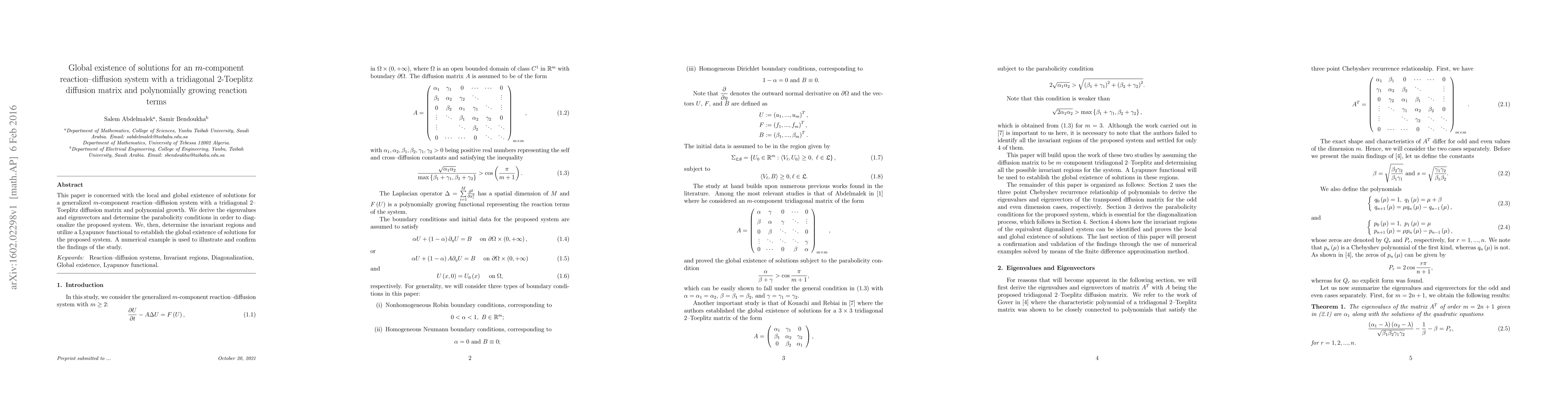 This paper is concerned with the local and global existence of solutions for a generalized $m$-component reaction--diffusion system with a tridiagonal $2$--Toeplitz diffusion matrix and polynomial growth. We derive the eigenvalues and eigenvectors and determine the parabolicity conditions in order to diagonalize the proposed system. We, then,determine the invariant regions and utilize a Lyapunov functional to establish the global existence of solutions for the proposed system. A numerical example is used to illustrate and confirm the findings of the study.