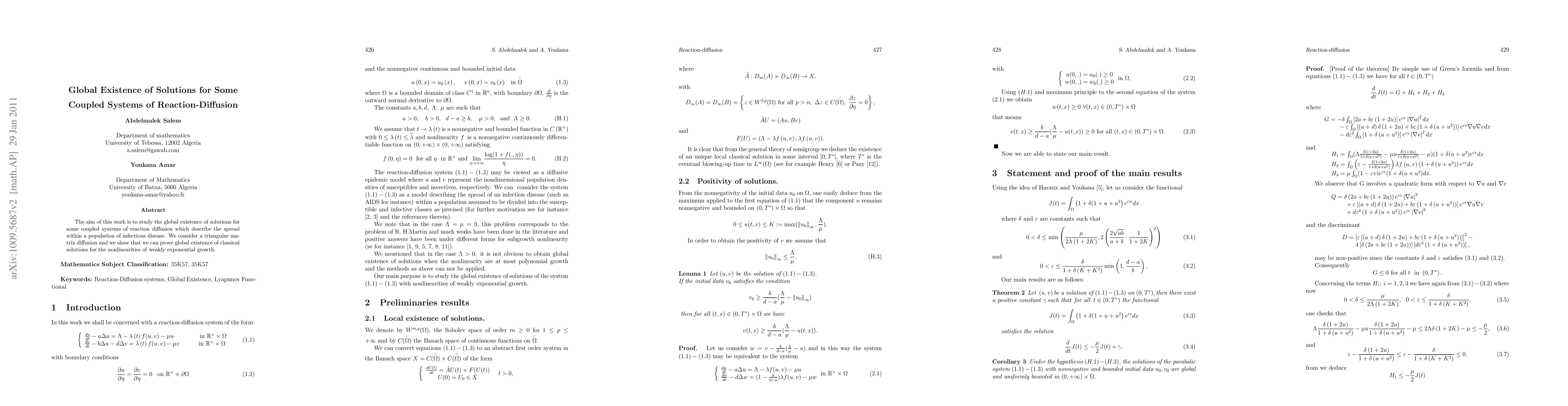 Summary: This paper investigates the global existence of classical solutions for coupled reaction-diffusion systems modeling the spread of infectious diseases, demonstrating that such solutions exist for nonlinearities with weakly exponential growth under a triangular matrix diffusion framework.