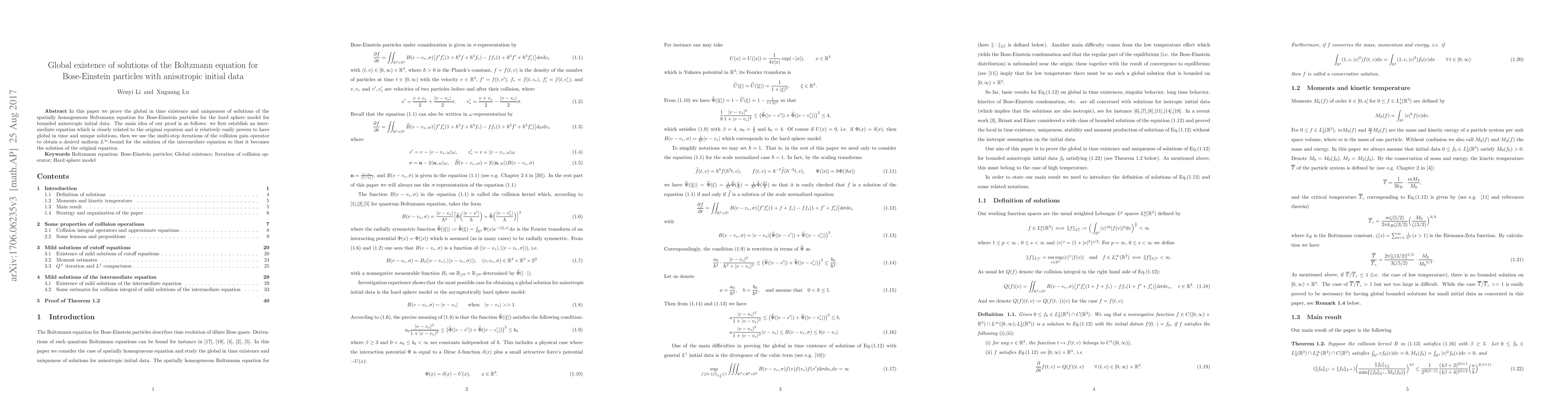 This paper proves the global existence and uniqueness of solutions to the Boltzmann equation for Bose-Einstein particles with anisotropic initial data. The proof utilizes an intermediate equation with easier global existence properties, followed by multi-step iterations to establish a uniform L1-bound, ultimately confirming the solution of the original equation.