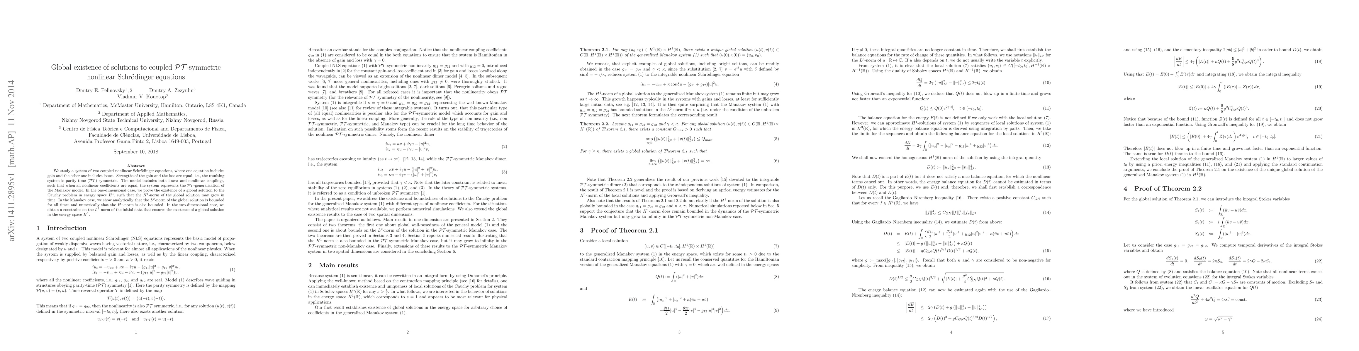 We study a system of two coupled nonlinear Schr\"{o}dinger equations, where one equation includes gain and the other one includes losses. Strengths of the gain and the loss are equal, i.e., the resulting system is parity-time (${\cal PT}$) symmetric. The model includes both linear and nonlinear couplings, such that when all nonlinear coefficients are equal, the system represents the ${\cal PT}$-generalization of the Manakov model. In the one-dimensional case, we prove the existence of a global solution to the Cauchy problem in energy space $H^1$, such that the $H^1$-norm of the global solution may grow in time. In the Manakov case, we show analytically that the $L^2$-norm of the global solution is bounded for all times and numerically that the $H^1$-norm is also bounded. In the two-dimensional case, we obtain a constraint on the $L^2$-norm of the initial data that ensures the existence of a global solution in the energy space $H^1$.
