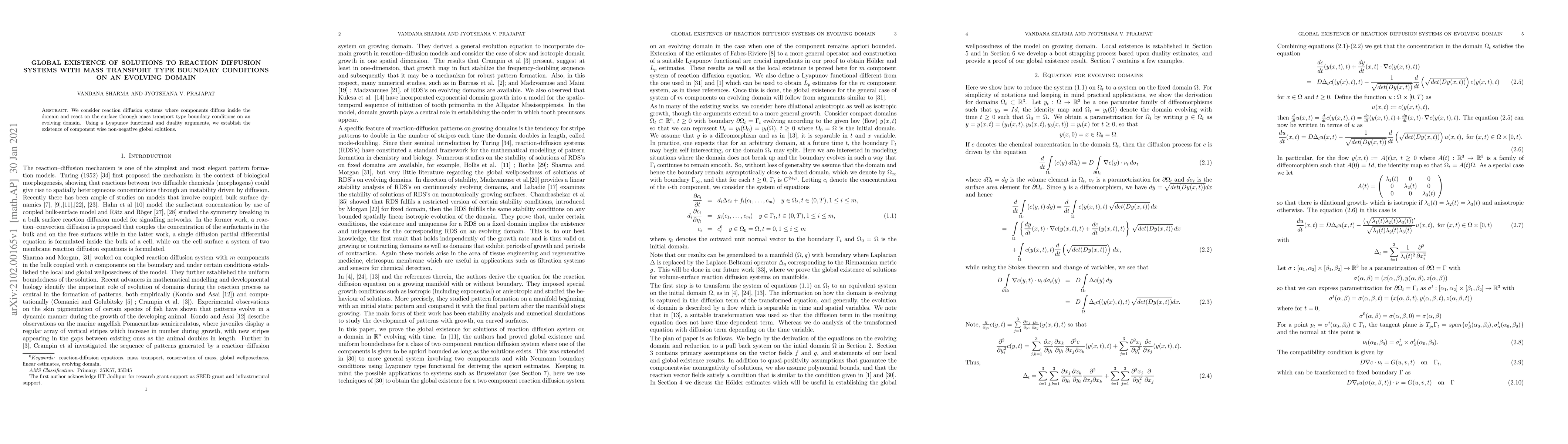 We consider reaction-diffusion systems where components diffuse inside the domain and react on the surface through mass transport type boundary conditions on an evolving domain. Using Lyapunov functional and duality arguments, we establish the existence of component-wise non-negative global solutions.