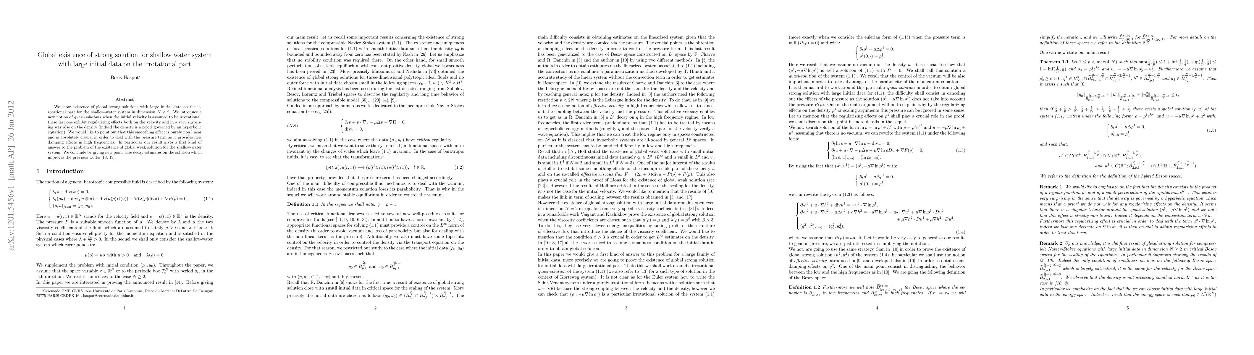 This paper establishes the global existence of strong solutions for the shallow-water system with large initial data on the irrotational part, introducing a new concept of quasi-solutions that exhibit regularizing effects on both velocity and density. The study highlights the crucial non-linear damping effects in high frequencies, providing new insights into the existence of global weak solutions.