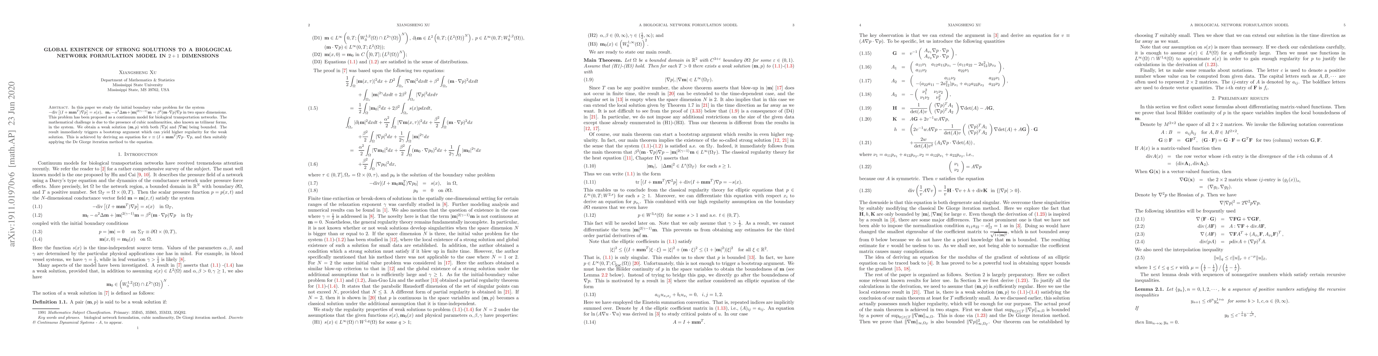 Researchers have developed a mathematical model for biological transportation networks in 2+1 dimensions, finding that strong solutions to the system exist globally, with implications for understanding complex systems.
