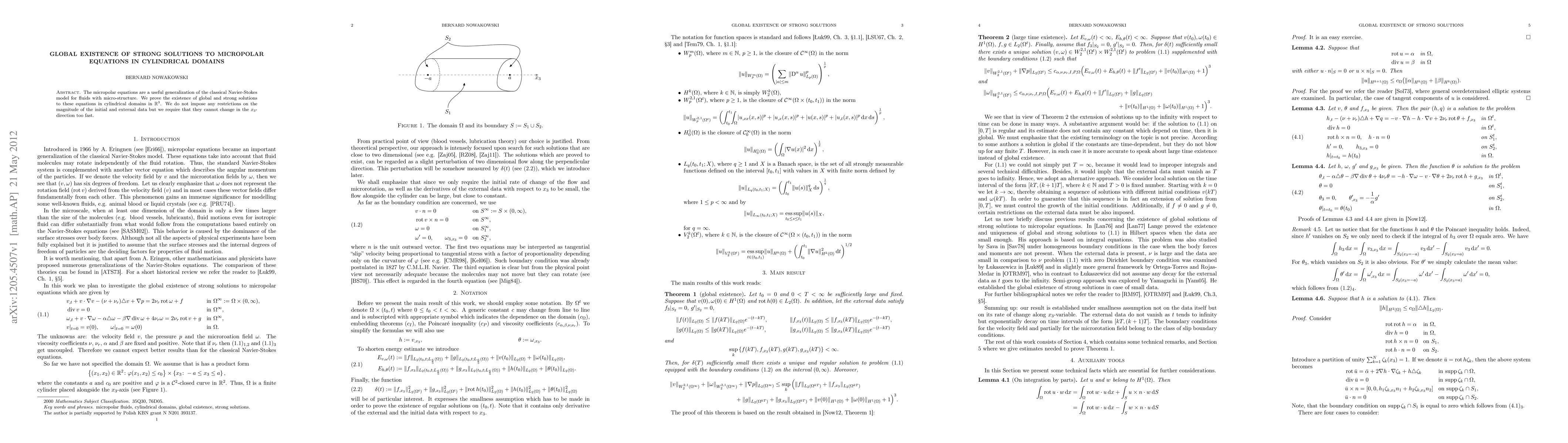 The micropolar equations are a useful generalization of the classical Navier-Stokes model for fluids with micro-structure. We prove the existence of global and strong solutions to these equations in cylindrical domains in $\mathbb{R}^3$. We do not impose any restrictions on the magnitude of the initial and external data but we require that they cannot change in the $x_3$-direction too fast.