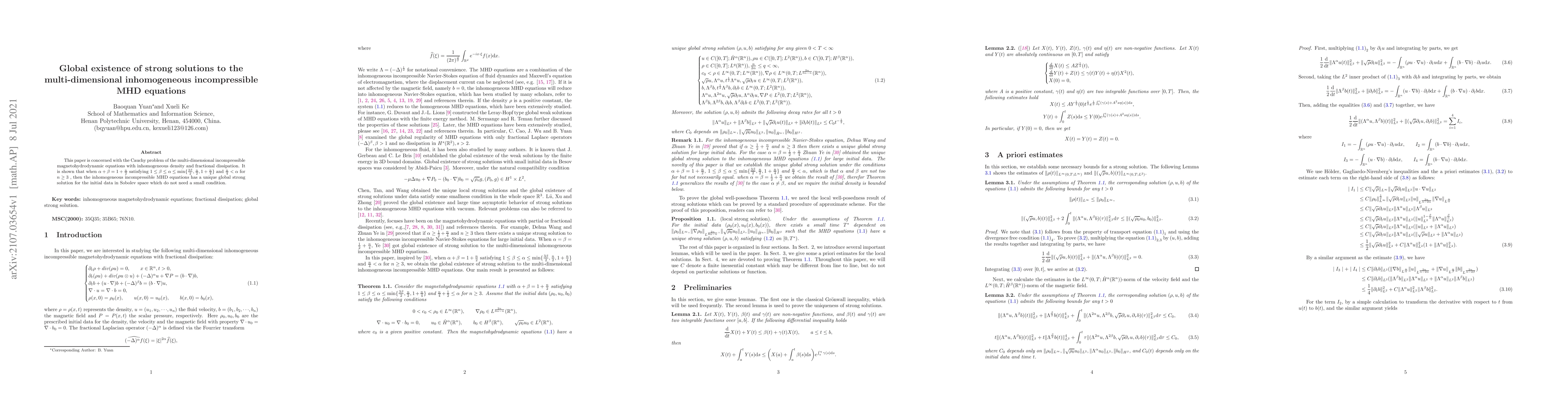 This paper proves the global existence of strong solutions for the multi-dimensional inhomogeneous incompressible MHD equations under specific conditions on the dissipation parameters. It demonstrates that such solutions exist globally without requiring smallness of initial data.
