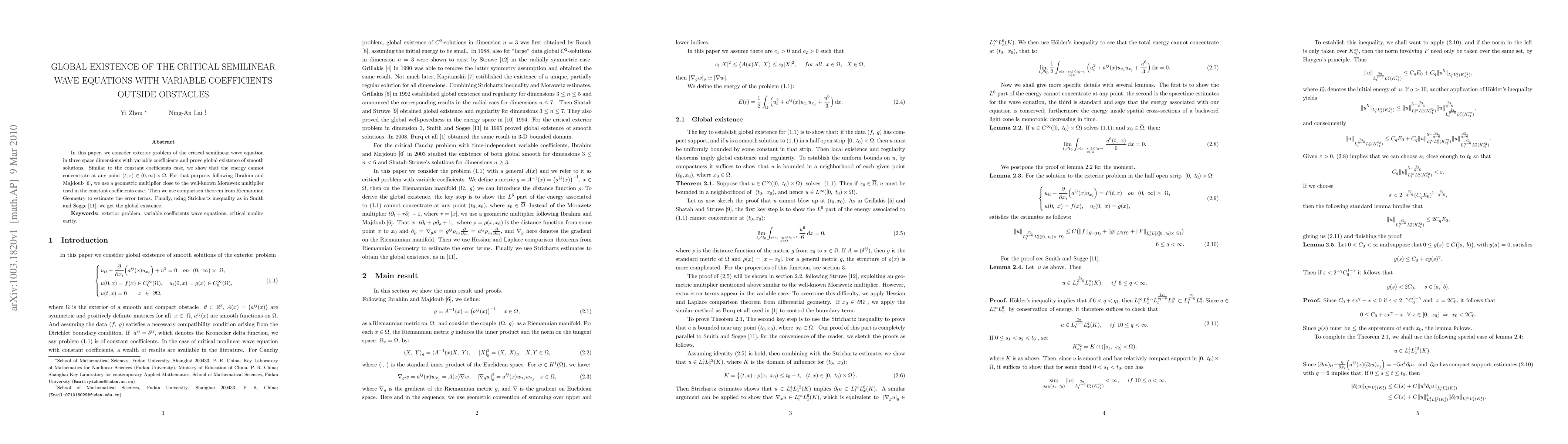 This paper proves global existence of smooth solutions for the critical semilinear wave equation in three dimensions outside obstacles, with variable coefficients. The authors utilize a geometric multiplier and comparison theorem from Riemannian Geometry, along with Strichartz inequality, to demonstrate that energy cannot concentrate, ensuring global existence.