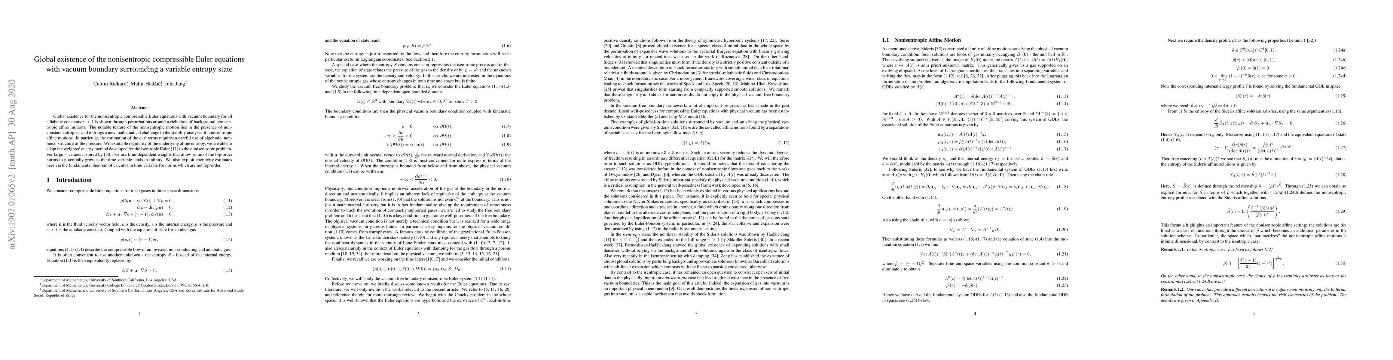 This paper demonstrates global existence for the nonisentropic compressible Euler equations with vacuum boundaries, addressing the challenge of non-constant entropy through perturbations around affine motions. The authors adapt the weighted energy method and employ time-dependent weights to manage potential norm growth, leveraging coercivity estimates for stability analysis.