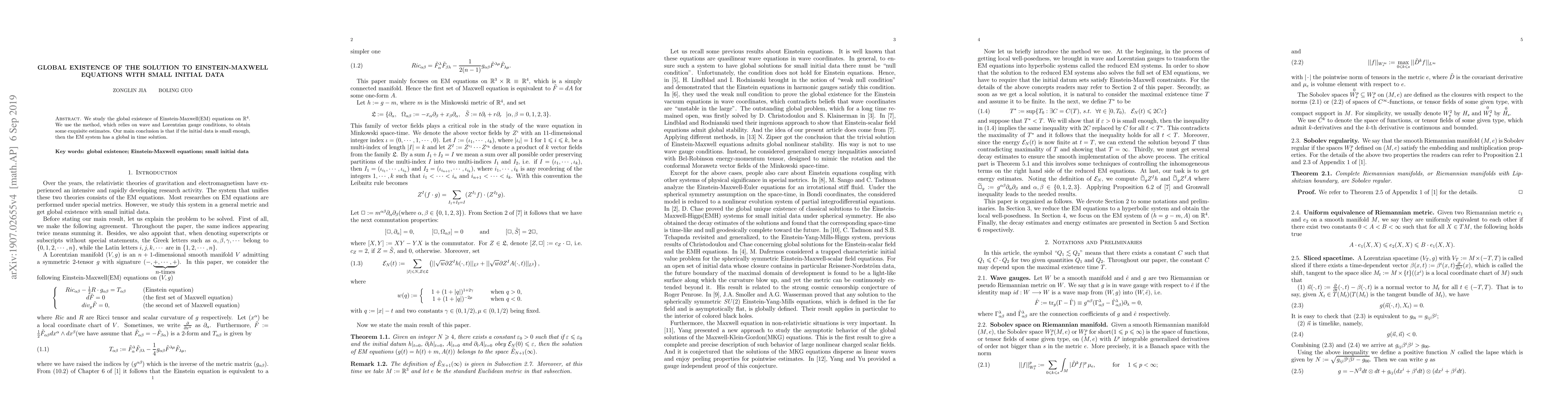 This paper investigates the global existence of solutions to Einstein-Maxwell equations in four-dimensional spacetime. Utilizing wave and Lorentzian gauge conditions, the authors demonstrate that small initial data guarantees a global-in-time solution to the EM system.