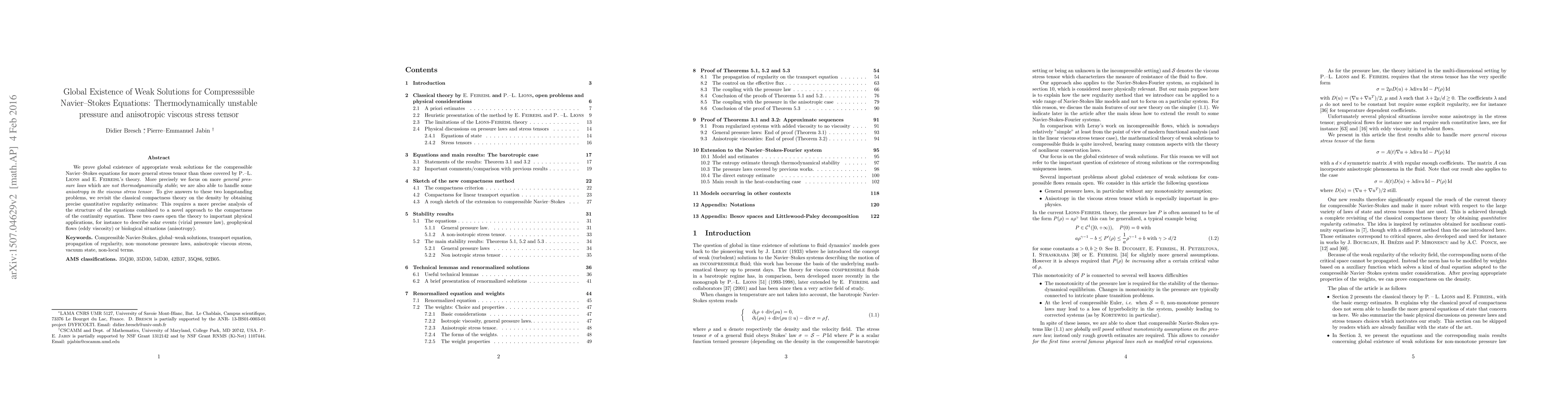 This paper proves global existence of weak solutions for compressible Navier-Stokes equations under thermodynamically unstable pressure and anisotropic viscous stress. It extends the theory to handle non-traditional pressure laws and anisotropic effects, providing significant implications for physical phenomena like solar events and geophysical flows.