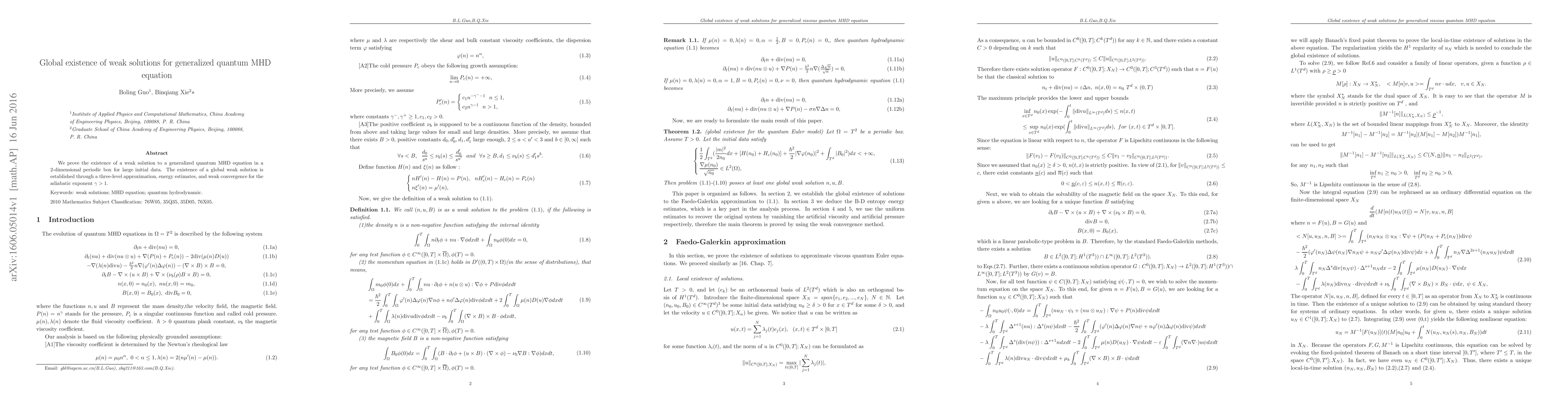 This paper proves the global existence of weak solutions to a generalized quantum magnetohydrodynamics (MHD) equation in a 2D periodic domain for large initial data. The proof utilizes a three-level approximation, energy estimates, and weak convergence techniques for the adiabatic exponent γ > 1.