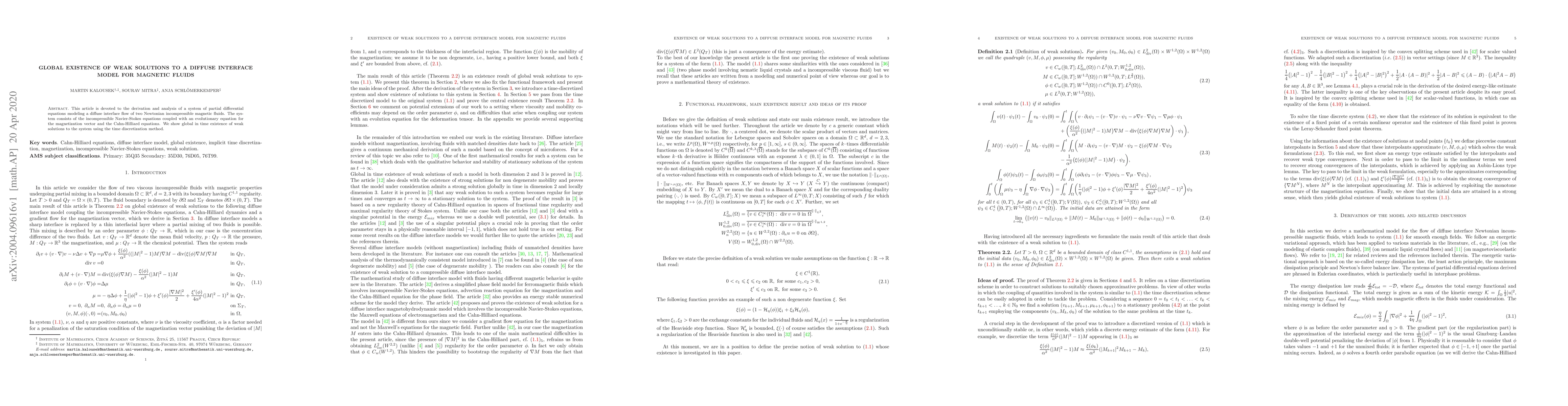 This paper derives and analyzes a system of partial differential equations modeling the flow of magnetic fluids, showing global in time existence of weak solutions using time discretization. The system combines Navier-Stokes, magnetization, and Cahn-Hilliard equations.