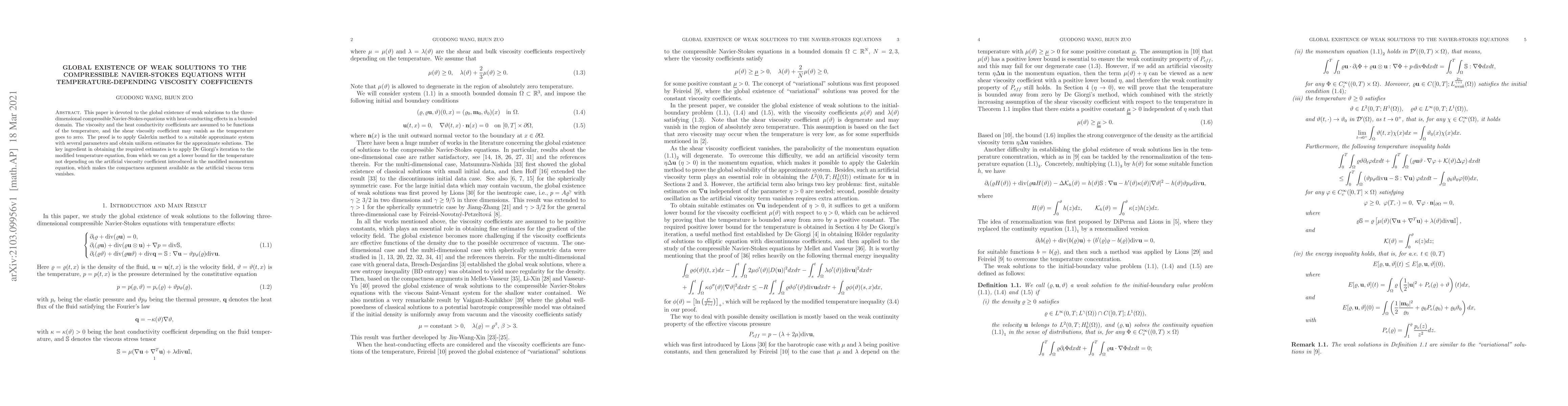This paper is devoted to the global existence of weak solutions to the three-dimensional compressible Navier-Stokes equations with heat-conducting effects in a bounded domain. The viscosity and the heat conductivity coefficients are assumed to be functions of the temperature, and the shear viscosity coefficient may vanish as the temperature goes to zero. The proof is to apply Galerkin method to a suitable approximate system with several parameters and obtain uniform estimates for the approximate solutions. The key ingredient in obtaining the required estimates is to apply De Giorgi's iteration to the modified temperature equation, from which we can get a lower bound for the temperature not depending on the artificial viscosity coefficient introduced in the modified momentum equation, which makes the compactness argument available as the artificial viscous term vanishes.