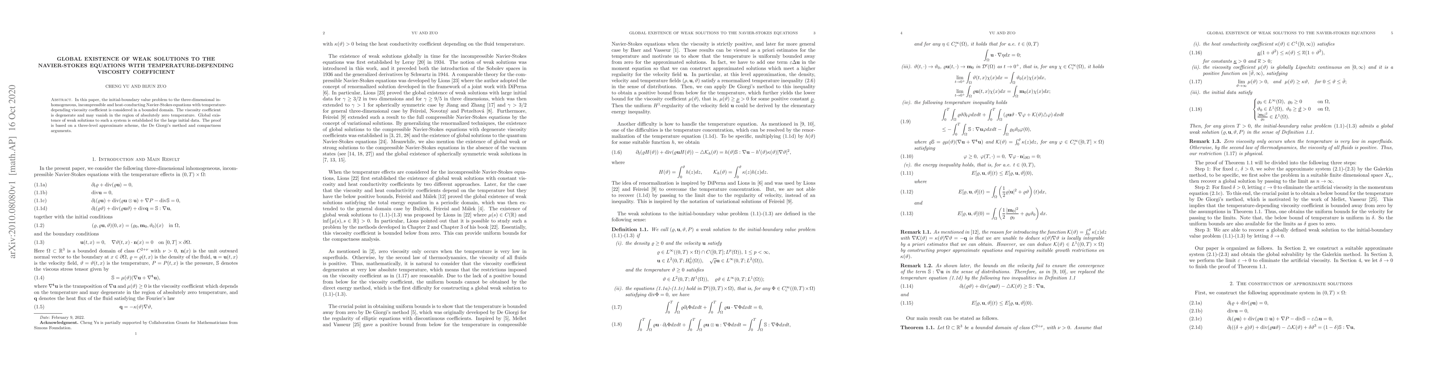 This paper establishes global existence of weak solutions to the three-dimensional Navier-Stokes equations with a temperature-dependent viscosity coefficient, even when the viscosity vanishes at absolute zero. The proof utilizes a three-level approximate scheme, De Giorgi's method, and compactness arguments.