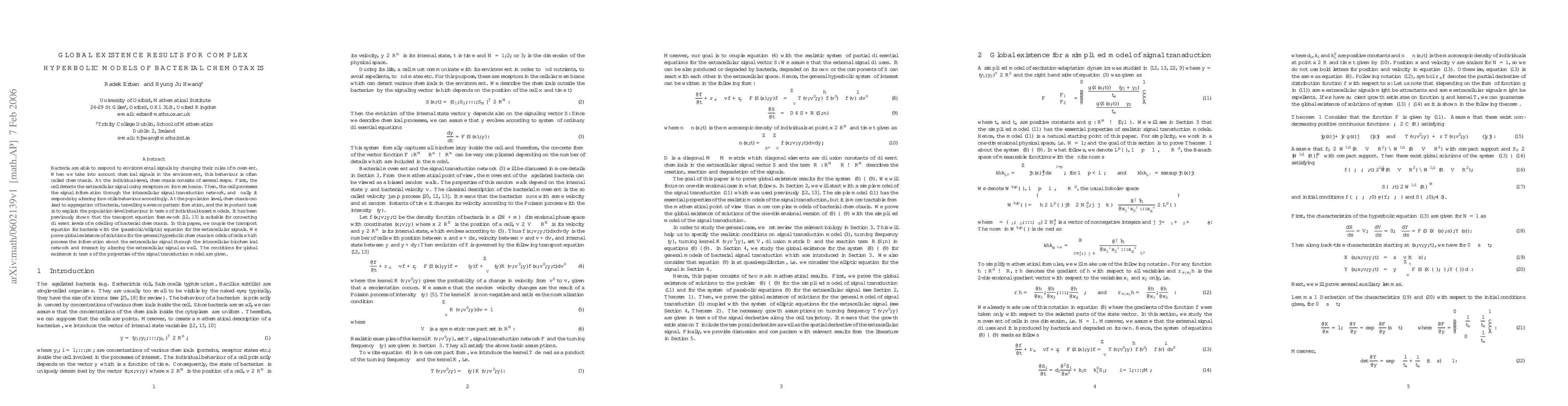 Bacteria are able to respond to environmental signals by changing their rules of movement. When we take into account chemical signals in the environment, this behaviour is often called chemotaxis. At the individual-level, chemotaxis consists of several steps. First, the cell detects the extracellular signal using receptors on its membrane. Then, the cell processes the signal information through the intracellular signal transduction network, and finally it responds by altering its motile behaviour accordingly. At the population level, chemotaxis can lead to aggregation of bacteria, travelling waves or pattern formation, and the important task is to explain the population-level behaviour in terms of individual-based models. It has been previously shown that the transport equation framework is suitable for connecting different levels of modelling of bacterial chemotaxis. In this paper, we couple the transport equation for bacteria with the (parabolic/elliptic) equation for the extracellular signals. We prove global existence of solutions for the general hyperbolic chemotaxis models of cells which process the information about the extracellular signal through the intracellular biochemical network and interact by altering the extracellular signal as well. The conditions for global existence in terms of the properties of the signal transduction model are given.