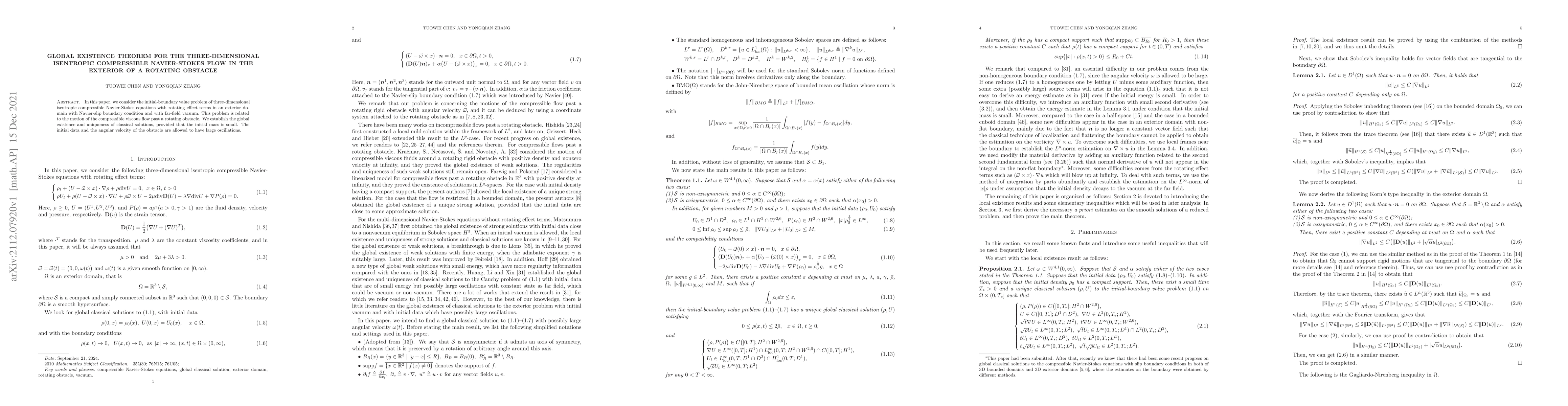 This paper establishes a global existence theorem for three-dimensional isentropic compressible Navier-Stokes flow around a rotating obstacle, proving the existence and uniqueness of classical solutions under small initial mass conditions, despite large oscillations in initial data and obstacle rotation.