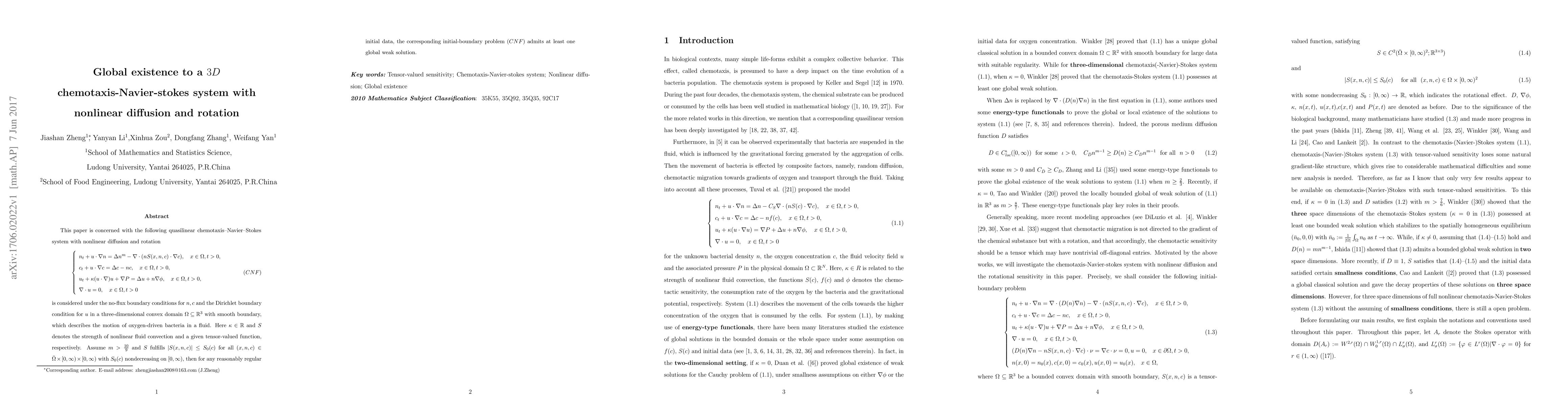 Researchers proved that a 3D system modeling bacterial movement in fluid under certain conditions admits at least one global weak solution for reasonably regular initial data.