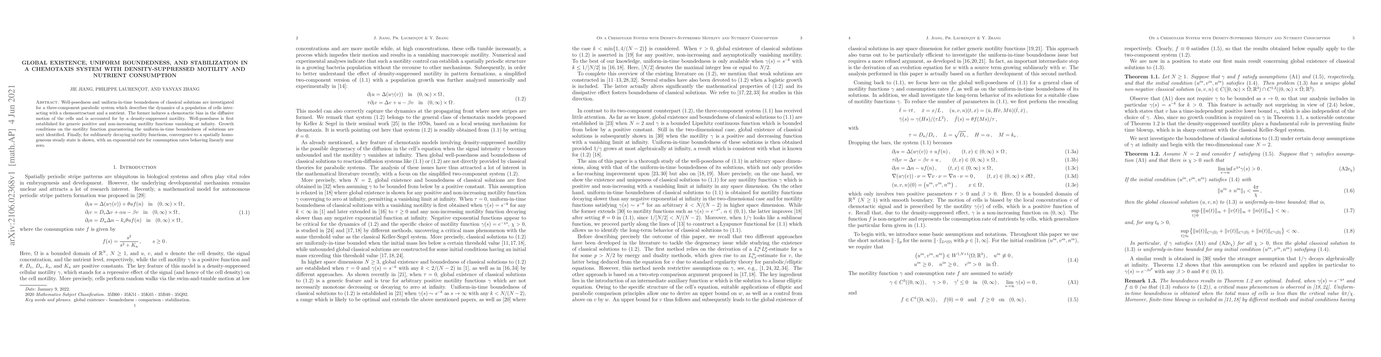 This paper investigates the well-posedness and uniform-in-time boundedness of solutions for a chemotaxis system with density-suppressed motility and nutrient consumption, establishing existence and stabilization to a steady state under specific growth conditions.