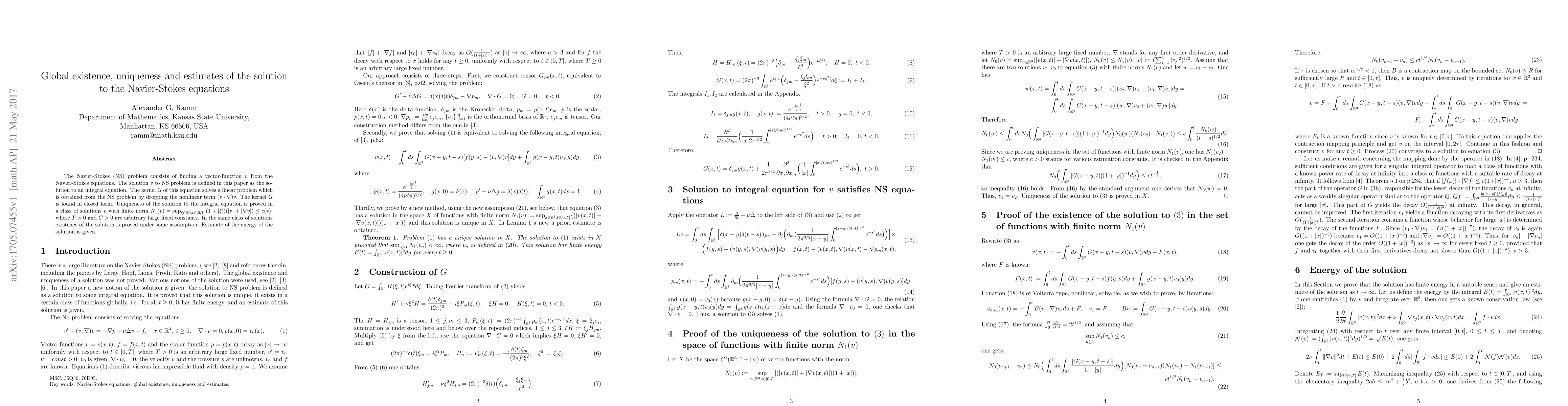The Navier-Stokes (NS) problem consists of finding a vector-function $v$ from the Navier-Stokes equations. The solution $v$ to NS problem is defined in this paper as the solution to an integral equation. The kernel $G$ of this equation solves a linear problem which is obtained from the NS problem by dropping the nonlinear term $(v \cdot \nabla)v$. The kernel $G$ is found in closed form. Uniqueness of the solution to the integral equation is proved in a class of solutions $v$ with finite norm $N_1(v)=\sup_{\xi\in \mathbb{R}^3, t\in [0, T]}(1+|\xi|)(|v|+|\nabla v|)\le c (*)$, where $T>0$ and $C>0$ are arbitrary large fixed constants. In the same class of solutions existence of the solution is proved under some assumption. Estimate of the energy of the solution is given.