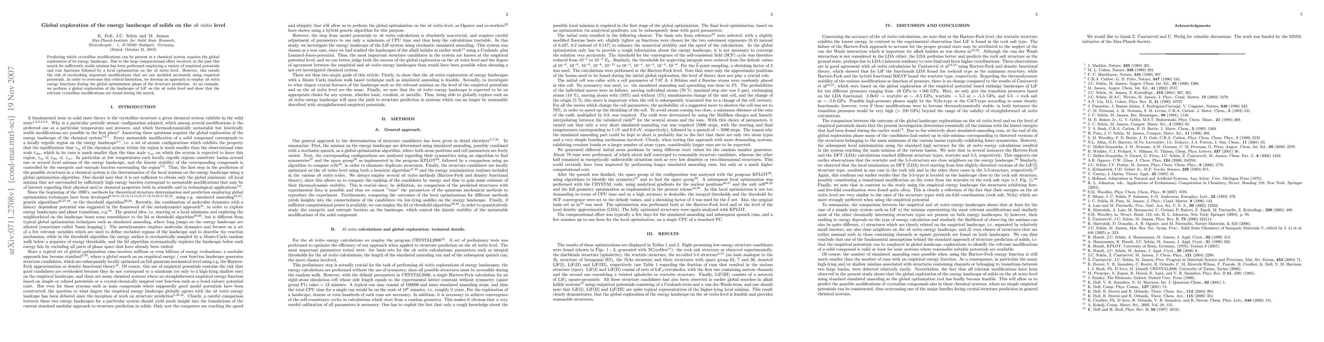The research employs ab initio energy functions during the global optimization phase for exploring the energy landscape of solids, using LiF as an example. The method involves simulated annealing followed by a quench and subsequent local optimization with high accuracy.
