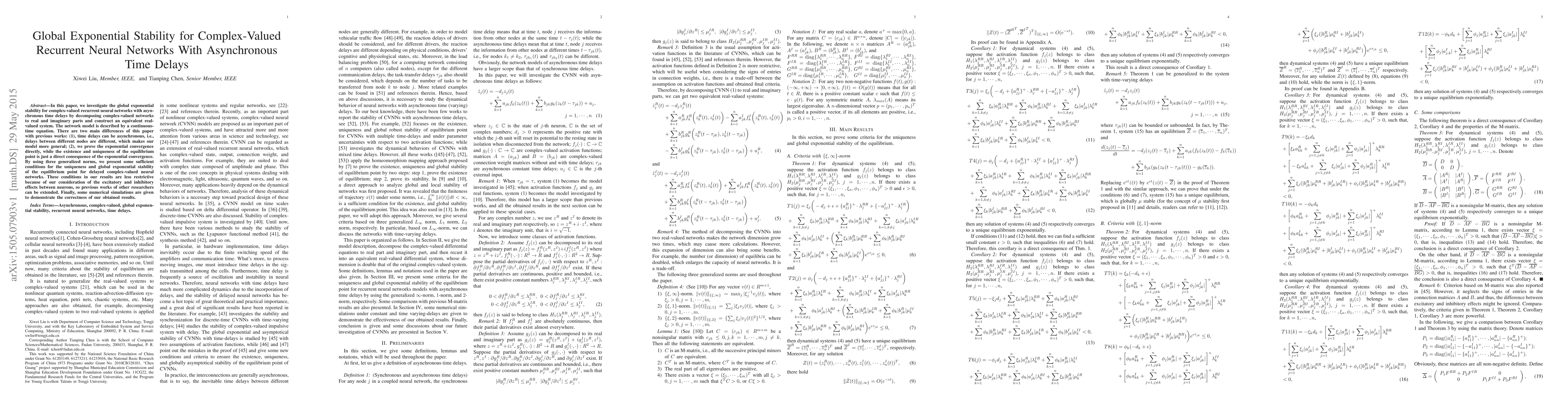 This paper explores global exponential stability in complex-valued neural networks with asynchronous time delays, decomposing them into real and imaginary parts to construct an equivalent real-valued system. It presents less restrictive conditions for stability, considering excitatory and inhibitory neuron interactions, and demonstrates results through numerical simulations.