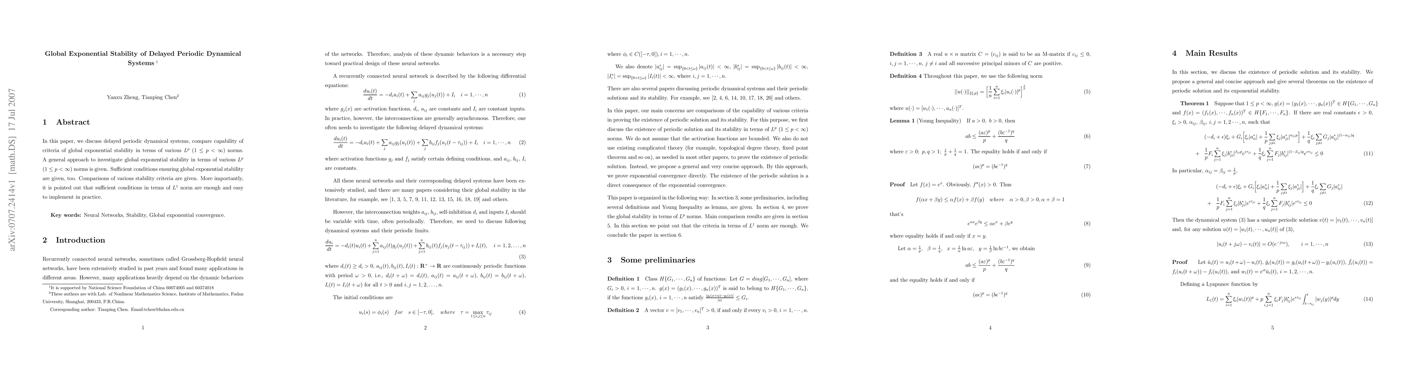 This paper investigates delayed periodic dynamical systems and compares criteria for global exponential stability across various $L^{p}$ norms. It provides sufficient conditions for stability and highlights that $L^{1}$ norm conditions are both sufficient and practical for implementation.