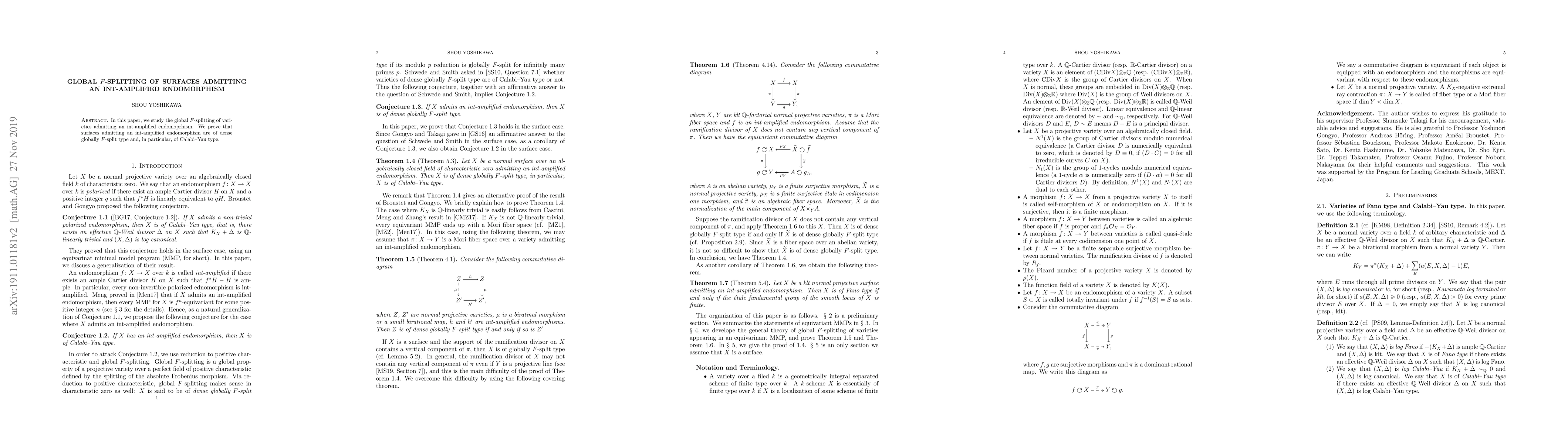 Research finds that surfaces admitting an int-amplified endomorphism are of Calabi-Yau type, specifically globally F-split.