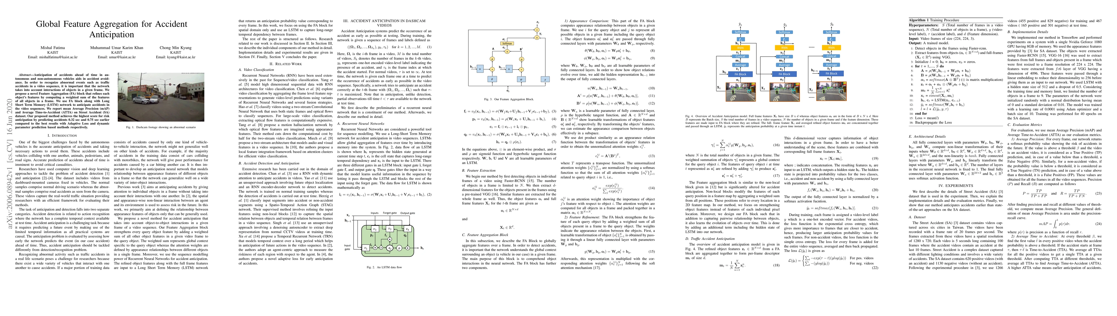 This paper proposes a novel Feature Aggregation block to refine object features by aggregating global interactions in video frames, combined with an LSTM network to anticipate traffic accidents. The method achieves superior performance in predicting accidents earlier than existing methods, as shown by higher mean Average Precision (mAP) and Average Time-to-Accident (ATTA) scores on the Street Accident dataset.