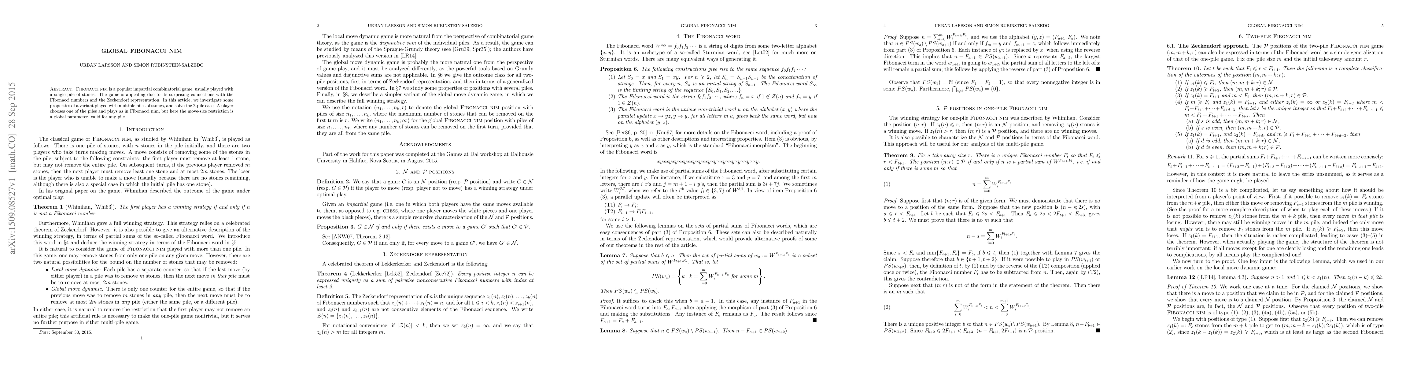 This paper explores a variant of Fibonacci nim played with multiple piles, where a global move-size restriction applies to all piles. The authors solve the 2-pile case and investigate properties of this multi-pile version of the game.