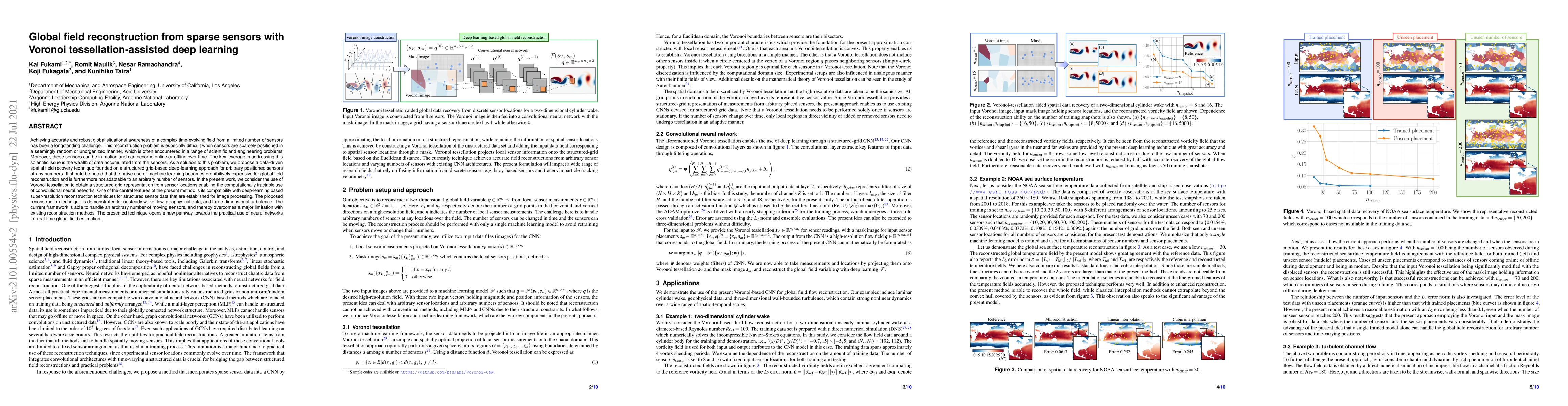 This paper proposes a deep-learning approach using Voronoi tessellation to reconstruct global fields from sparse, arbitrarily positioned sensors. The method transforms sensor locations into a structured grid, enabling efficient convolutional neural networks for real-time field estimation, demonstrated across unsteady wake flow, geophysical data, and turbulence.