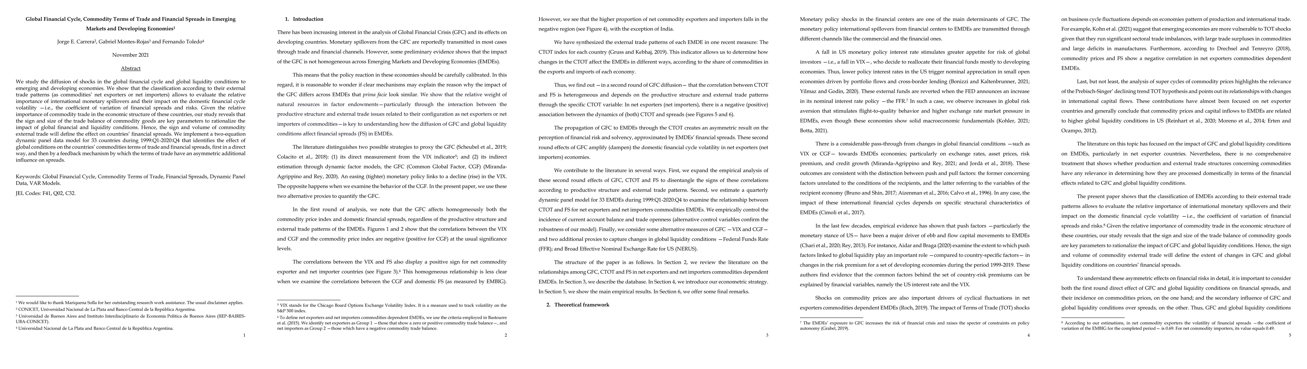 We study the diffusion of shocks in the global financial cycle and global liquidity conditions to emerging and developing economies. We show that the classification according to their external trade patterns (as commodities' net exporters or net importers) allows to evaluate the relative importance of international monetary spillovers and their impact on the domestic financial cycle volatility -i.e., the coefficient of variation of financial spreads and risks. Given the relative importance of commodity trade in the economic structure of these countries, our study reveals that the sign and size of the trade balance of commodity goods are key parameters to rationalize the impact of global financial and liquidity conditions. Hence, the sign and volume of commodity external trade will define the effect on countries' financial spreads. We implement a two-equation dynamic panel data model for 33 countries during 1999:Q1-2020:Q4 that identifies the effect of global conditions on the countries' commodities terms of trade and financial spreads, first in a direct way, and then by a feedback mechanism by which the terms of trade have an asymmetric additional influence on spreads.
