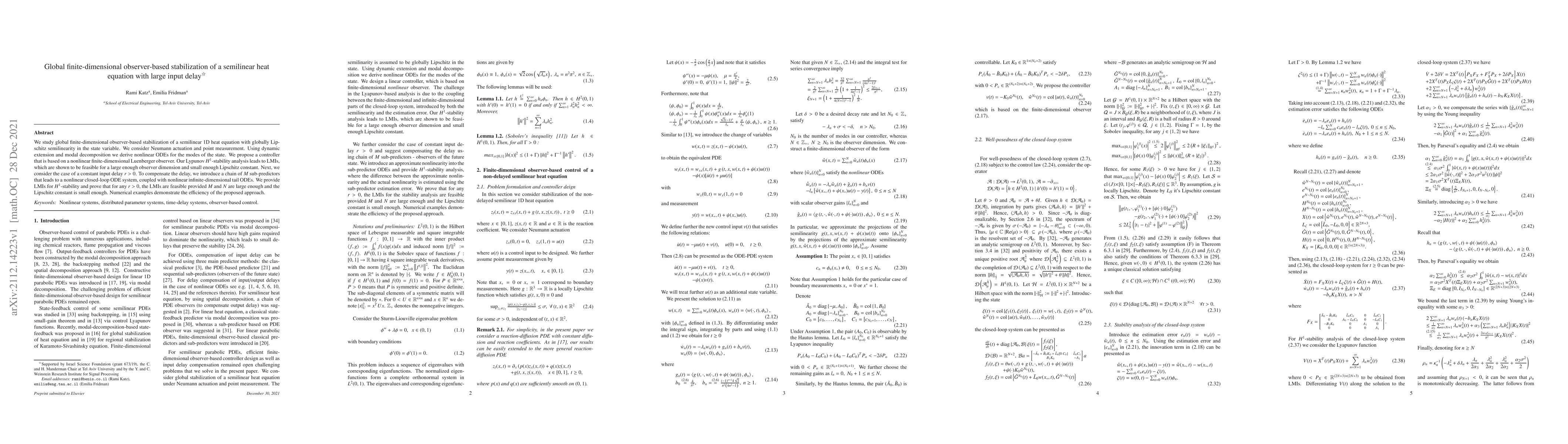 The paper proposes a finite-dimensional observer-based controller for global stabilization of a semilinear heat equation with large input delay, utilizing dynamic extension and modal decomposition to derive nonlinear ODEs for state modes, and employing Lyapunov stability analysis leading to LMIs for feasibility.