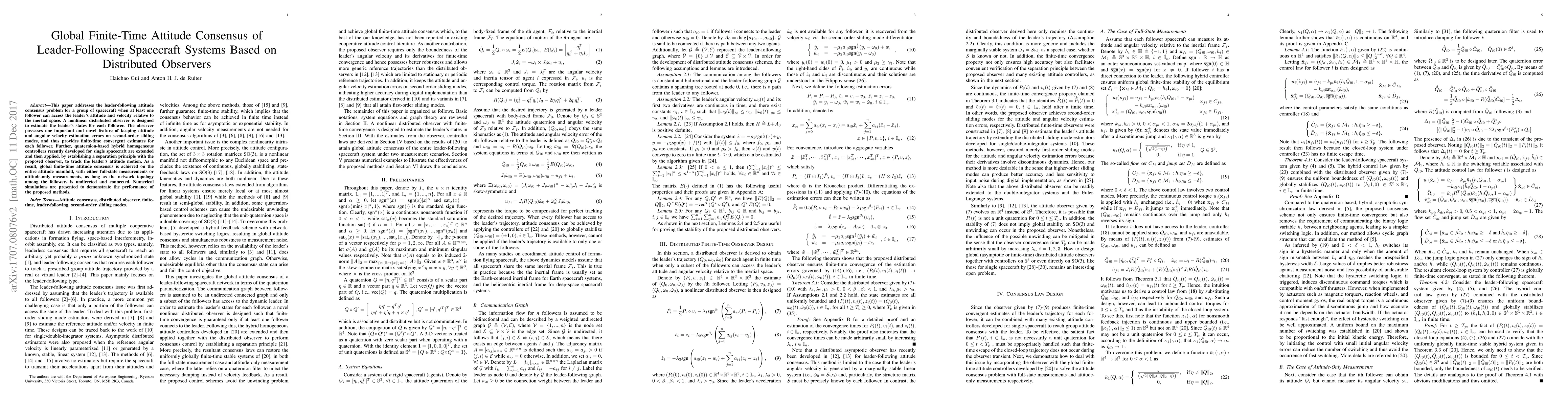 This paper proposes a method for achieving global finite-time attitude consensus among spacecraft in a leader-following configuration using distributed observers and quaternion-based controllers. The designed observer ensures finite-time convergence of attitude and angular velocity estimates, enabling consensus even with limited measurements.