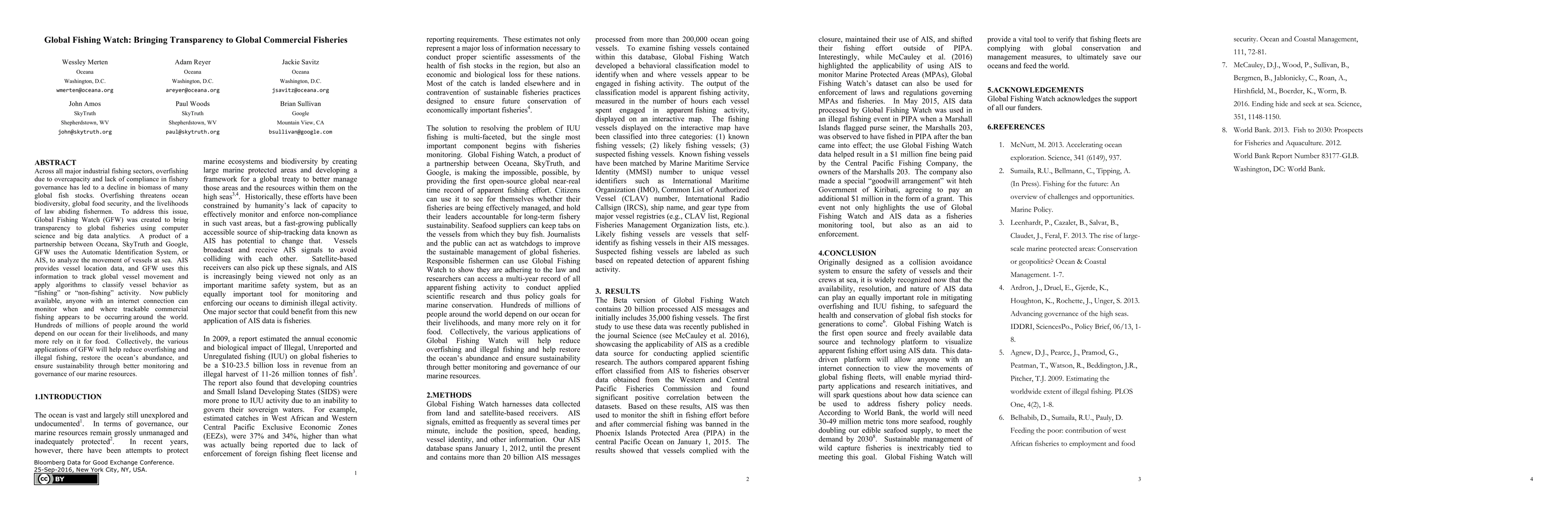 Across all major industrial fishing sectors, overfishing due to overcapacity and lack of compliance in fishery governance has led to a decline in biomass of many global fish stocks. Overfishing threatens ocean biodiversity, global food security, and the livelihoods of law abiding fishermen. To address this issue, Global Fishing Watch (GFW) was created to bring transparency to global fisheries using computer science and big data analytics. A product of a partnership between Oceana, SkyTruth and Google, GFW uses the Automatic Identification System, or AIS, to analyze the movement of vessels at sea. AIS provides vessel location data, and GFW uses this information to track global vessel movement and apply algorithms to classify vessel behavior as "fishing" or "non-fishing" activity. Now publicly available, anyone with an internet connection can monitor when and where trackable commercial fishing appears to be occurring around the world. Hundreds of millions of people around the world depend on our ocean for their livelihoods, and many more rely on it for food. Collectively, the various applications of GFW will help reduce overfishing and illegal fishing, restore the ocean's abundance, and ensure sustainability through better monitoring and governance of our marine resources.