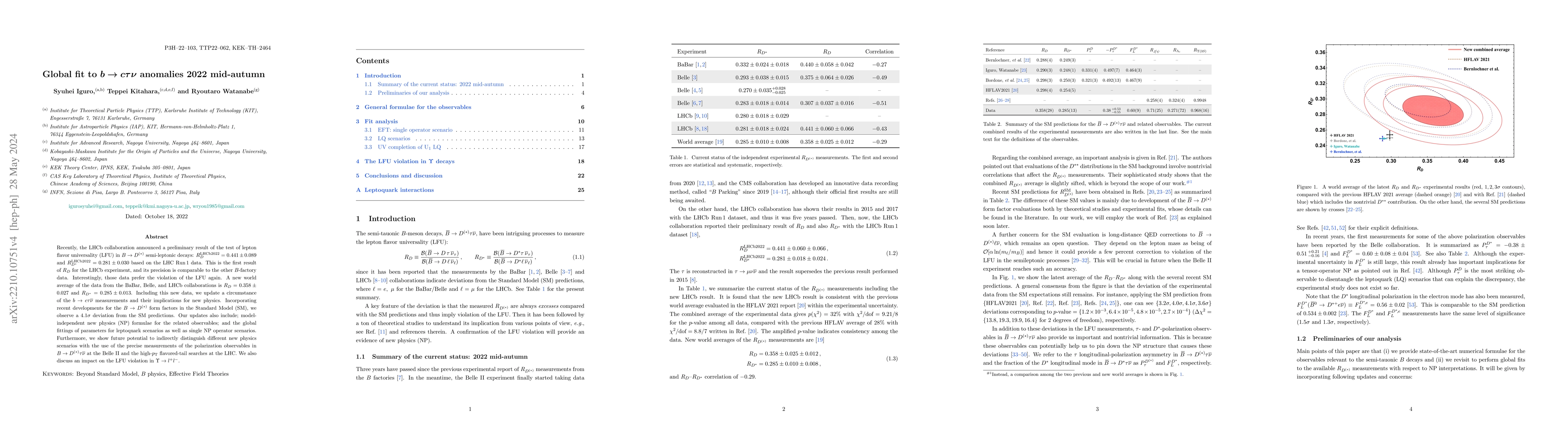 Recently, the LHCb collaboration announced a preliminary result of the test of lepton flavor universality (LFU) in $B\to D^{(\ast)}$ semi-leptonic decays: $R_{D}^{\rm LHCb2022} = 0.441 \pm 0.089$ and $R_{D^{\ast}}^{\rm LHCb2022} = 0.281 \pm 0.030$ based on the LHC Run 1 data. This is the first result of $R_{D}$ for the LHCb experiment, and its precision is comparable to the other $B$-factory data. Interestingly, those data prefer the violation of the LFU again. A new world average of the data from the BaBar, Belle, and LHCb collaborations is $R_{D} = 0.358 \pm 0.027$ and $R_{D^{\ast}} = 0.285 \pm 0.013$. Including this new data, we update a circumstance of the $b \to c \tau \overline\nu$ measurements and their implications for new physics. Incorporating recent developments for the $B \to D^{(\ast)}$ form factors in the Standard Model (SM), we observe a $4.1 \sigma$ deviation from the SM predictions. Our updates also include; model-independent new physics (NP) formulae for the related observables; and the global fittings of parameters for leptoquark scenarios as well as single NP operator scenarios. Furthermore, we show future potential to indirectly distinguish different new physics scenarios with the use of the precise measurements of the polarization observables in $B\to D^{(\ast)}\tau \overline\nu$ at the Belle II and the high-$p_{\rm T}$ flavored-tail searches at the LHC. We also discuss an impact on the LFU violation in $\Upsilon \to l^+ l^-$.