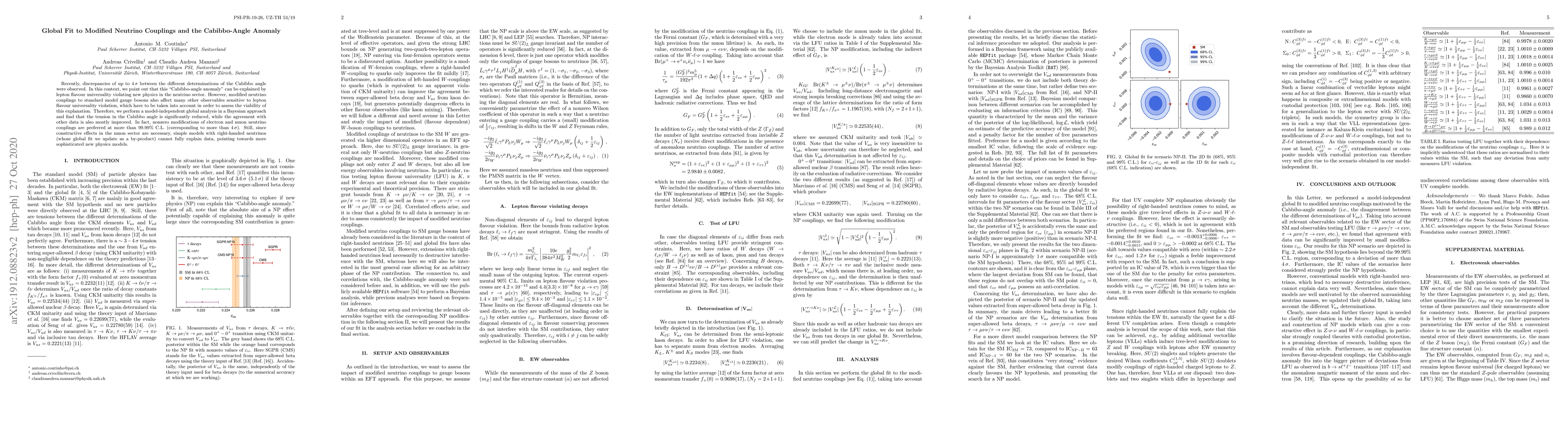 This paper investigates the "Cabibbo-angle anomaly" through a global fit to modified neutrino couplings, finding that discrepancies are reduced and non-zero modifications of electron and muon neutrino couplings are preferred. However, simple models with right-handed neutrinos cannot fully explain the data, suggesting more complex new physics is needed.