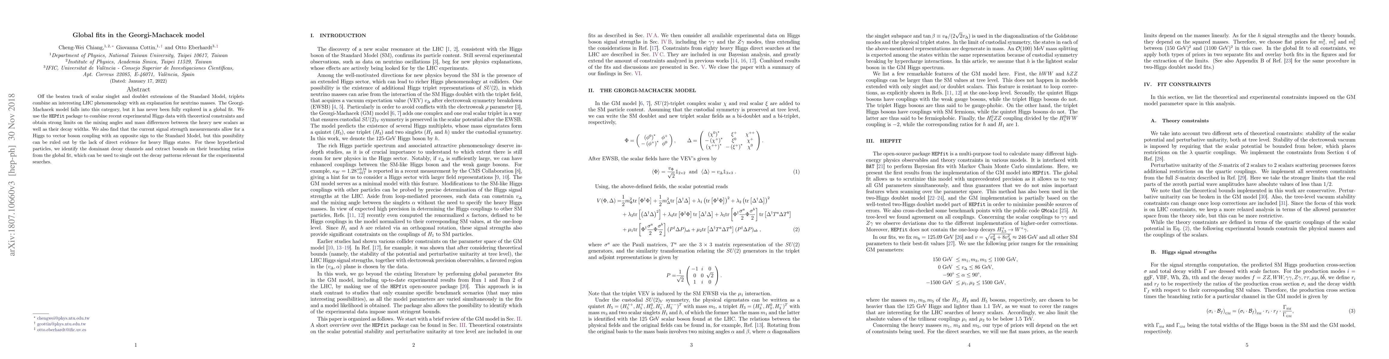 The paper presents a comprehensive global fit in the Georgi-Machacek model, utilizing the HEPfit package to combine experimental data with theoretical constraints, providing detailed bounds on model parameters.