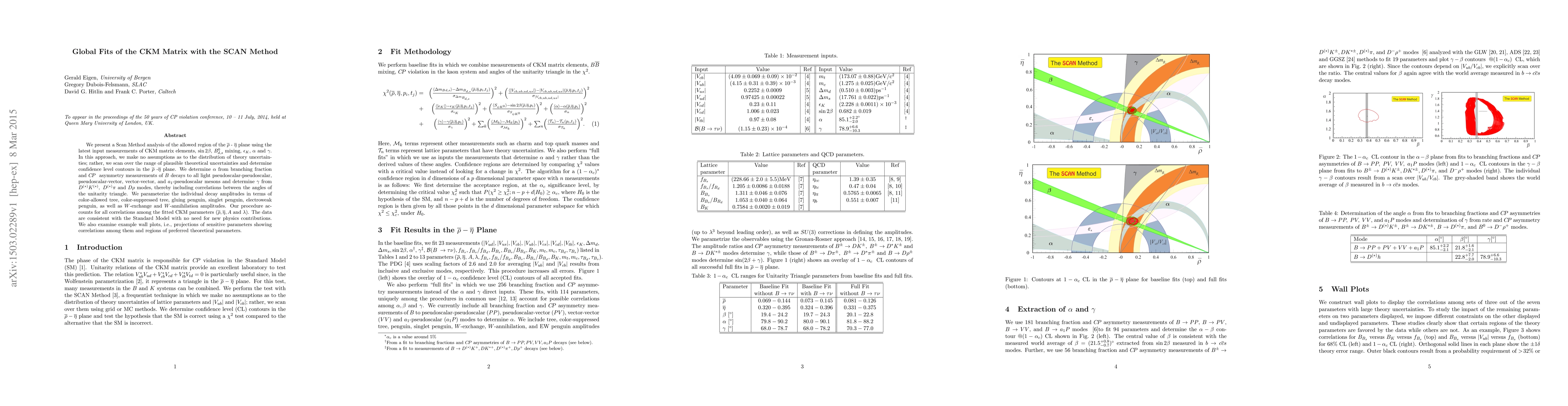 This paper employs a Scan Method to analyze the CKM matrix's rho bar-eta bar plane using the latest measurements, determining confidence contours without assuming theory uncertainties. The study derives alpha and gamma from various B decay measurements, finding consistency with the Standard Model without new physics.