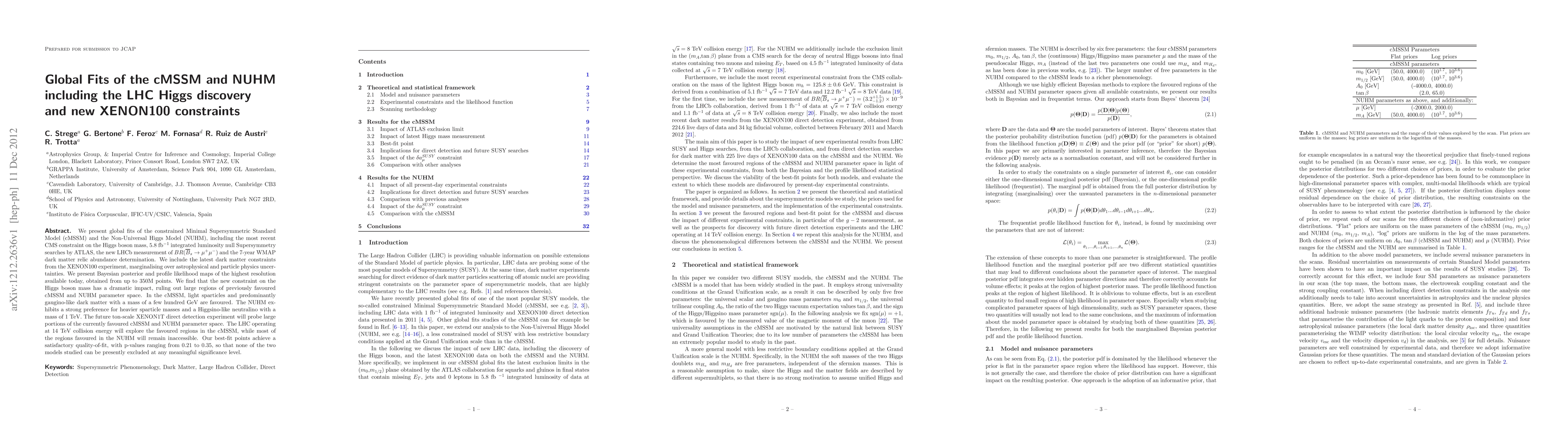 We present global fits of the constrained Minimal Supersymmetric Standard Model (cMSSM) and the Non-Universal Higgs Model (NUHM), including the most recent CMS constraint on the Higgs boson mass, 5.8/fb integrated luminosity null Supersymmetry searches by ATLAS, the new LHCb measurement of the Bs to mu+mu- branching ratio and the 7-year WMAP dark matter relic abundance determination. We include the latest dark matter constraints from the XENON100 experiment, marginalising over astrophysical and particle physics uncertainties. We present Bayesian posterior and profile likelihood maps of the highest resolution available today, obtained from up to 350M points. We find that the new constraint on the Higgs boson mass has a dramatic impact, ruling out large regions of previously favoured cMSSM and NUHM parameter space. In the cMSSM, light sparticles and predominantly gaugino-like dark matter with a mass of a few hundred GeV are favoured. The NUHM exhibits a strong preference for heavier sparticle masses and a Higgsino-like neutralino with a mass of 1 TeV. The future ton-scale XENON1T direct detection experiment will probe large portions of the currently favoured cMSSM and NUHM parameter space. The LHC operating at 14 TeV collision energy will explore the favoured regions in the cMSSM, while most of the regions favoured in the NUHM will remain inaccessible. Our best-fit points achieve a satisfactory quality-of-fit, with p-values ranging from 0.21 to 0.35, so that none of the two models studied can be presently excluded at any meaningful significance level.