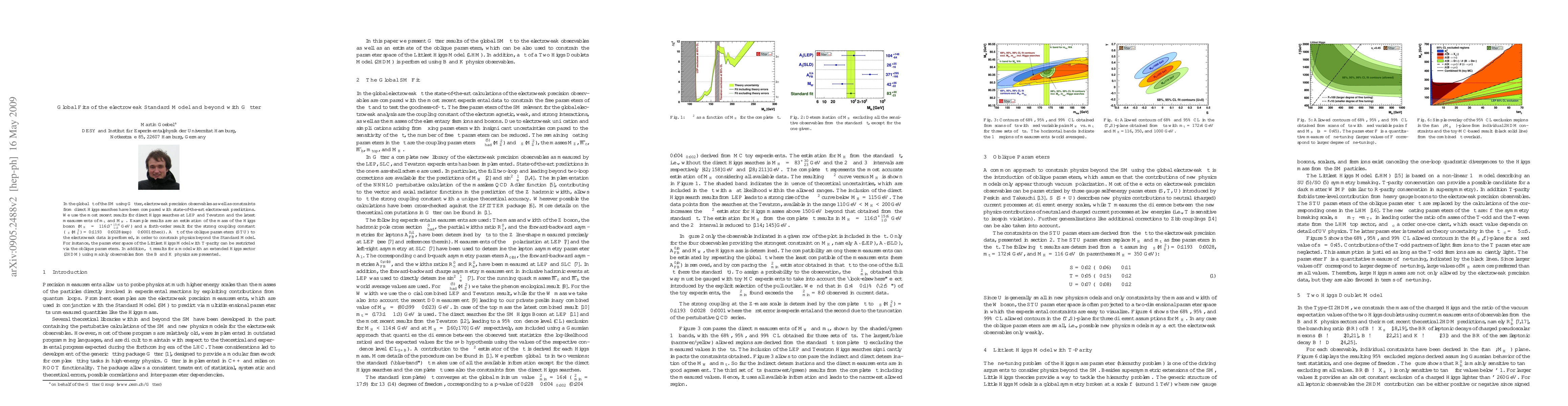 This paper presents global fits of the electroweak Standard Model using Gfitter, incorporating recent Higgs search results and measurements of top quark and W boson masses. It estimates the Higgs boson mass at M_H=116.3 ± 15.6 - 1.3 GeV and provides constraints on physics beyond the Standard Model through oblique parameters, including the Littlest Higgs Model with T-parity.