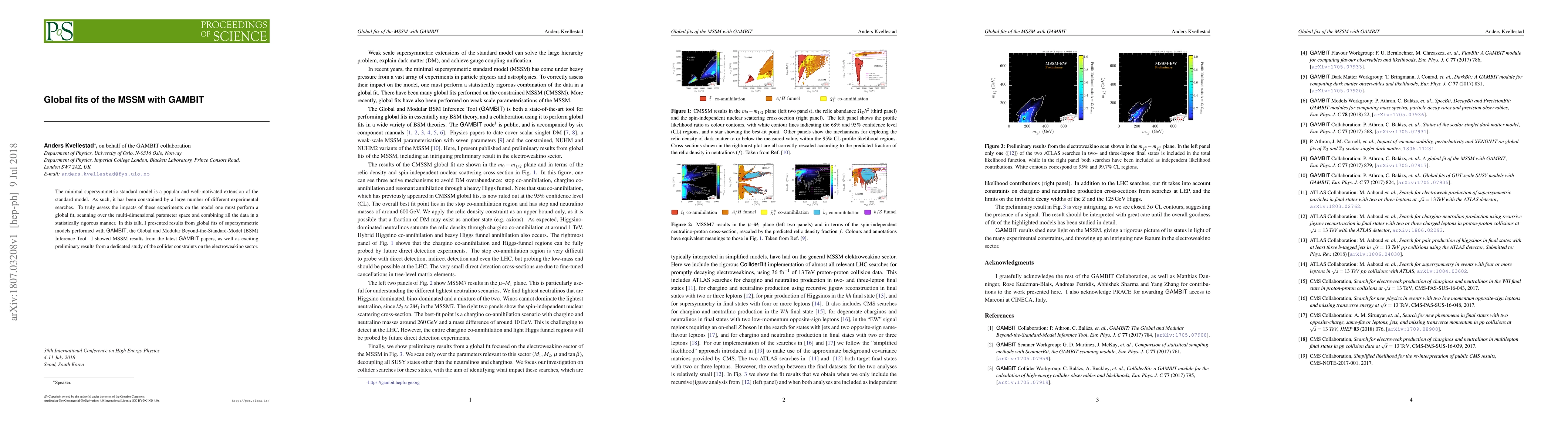 This paper presents global fits of the Minimal Supersymmetric Standard Model (MSSM) using GAMBIT, a comprehensive tool for beyond-the-standard-model inference. It combines experimental constraints from various sources to rigorously assess the model's viability, including recent preliminary results on collider constraints in the electroweakino sector.