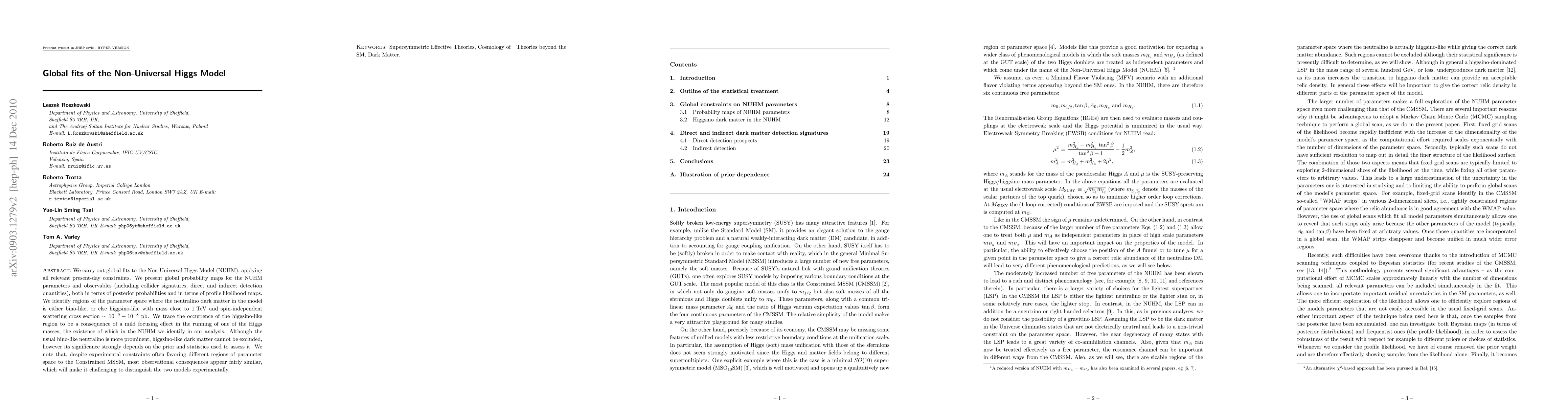 We carry out global fits to the Non-Universal Higgs Model (NUHM), applying all relevant present-day constraints. We present global probability maps for the NUHM parameters and observables (including collider signatures, direct and indirect detection quantities), both in terms of posterior probabilities and in terms of profile likelihood maps. We identify regions of the parameter space where the neutralino dark matter in the model is either bino-like, or else higgsino-like with mass close to 1 TeV and spin-independent scattering cross section ~ 10^{-9}-10^{-8} pb. We trace the occurrence of the higgsino-like region to be a consequence of a mild focusing effect in the running of one of the Higgs masses, the existence of which in the NUHM we identify in our analysis. Although the usual bino-like neutralino is more prominent, higgsino-like dark matter cannot be excluded, however its significance strongly depends on the prior and statistics used to assess it. We note that, despite experimental constraints often favoring different regions of parameter space to the Constrained MSSM, most observational consequences appear fairly similar, which will make it challenging to distinguish the two models experimentally